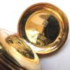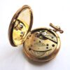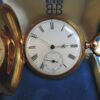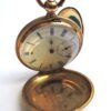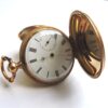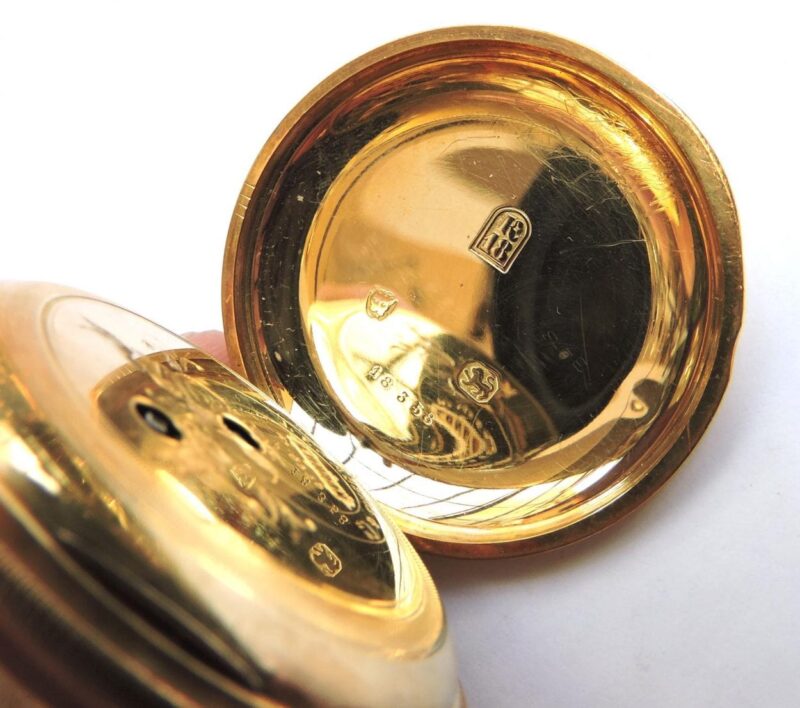The white enamel face has black Roman numerals and a seconds hand.  The back outer cover opens to reveal two key slots – 1 for winding the clock spring and the other to adjust the time.  All 3 cases marked 18k – 2 cases having English gold hallmarks.