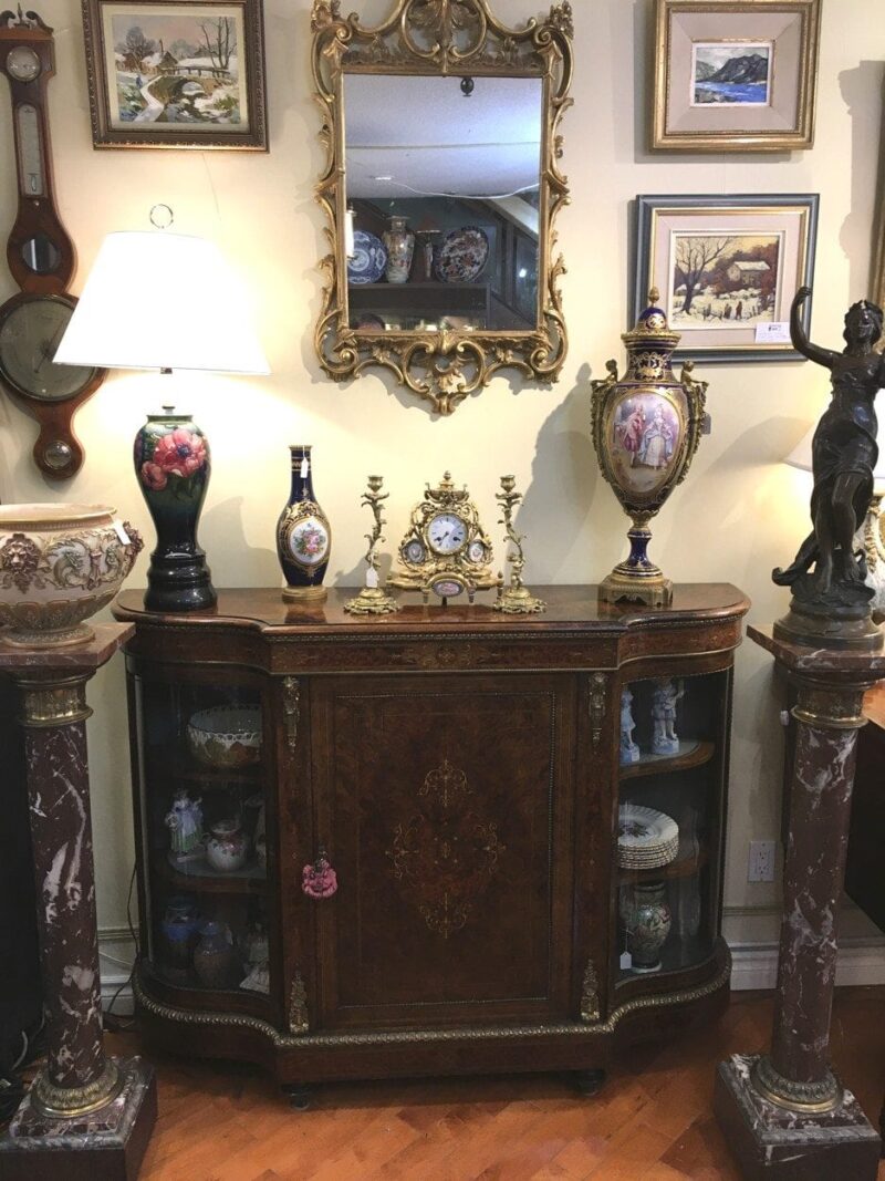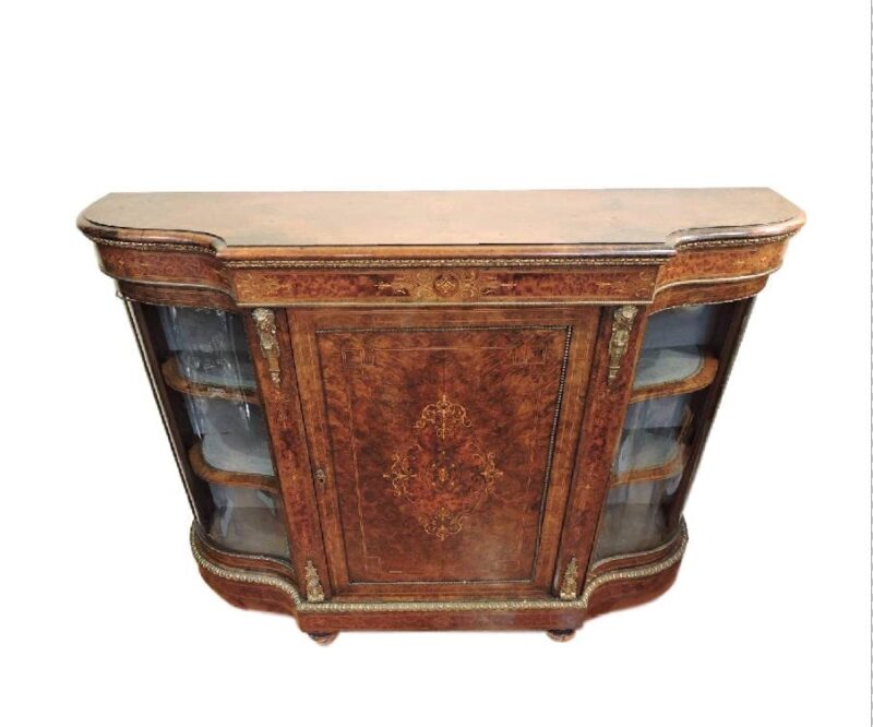 English 19th Century Burled Walnut Credenza – Curved glass Doors – circa 1860.