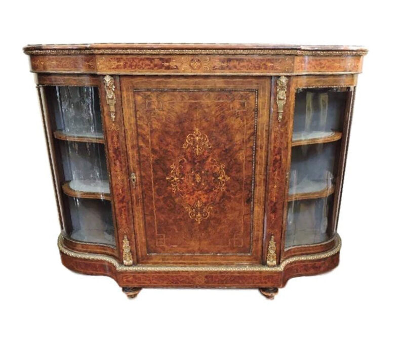 A beautiful quality burled walnut credenza with curved glass doors and covered centre storage.  Brass trim and mounts – with rams heads.  Intricate fruit wood inlay decorates the centre door and front borders.  Velvet lined shelves.  19th Century, dates circa 1860.