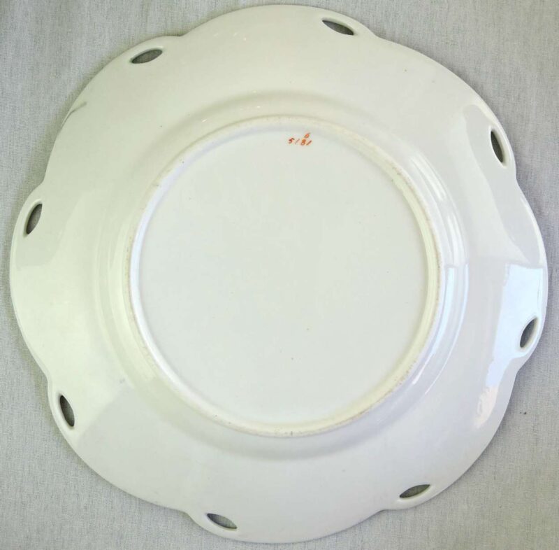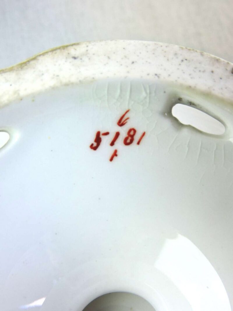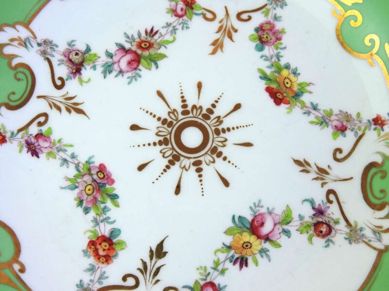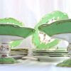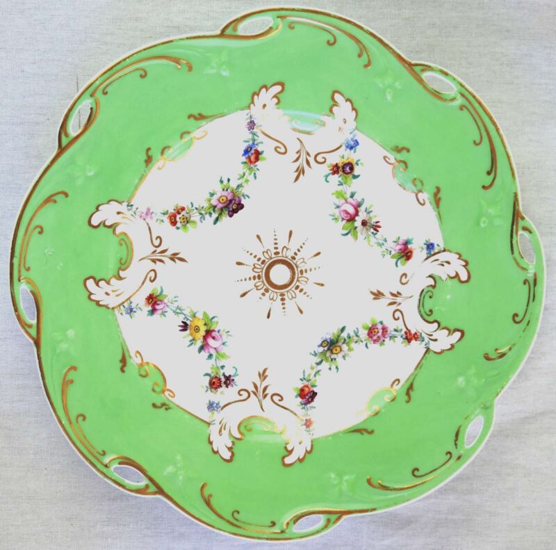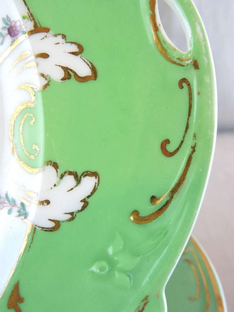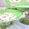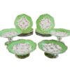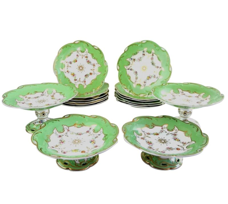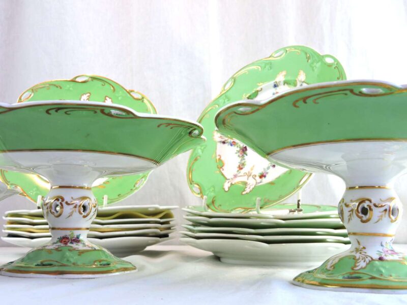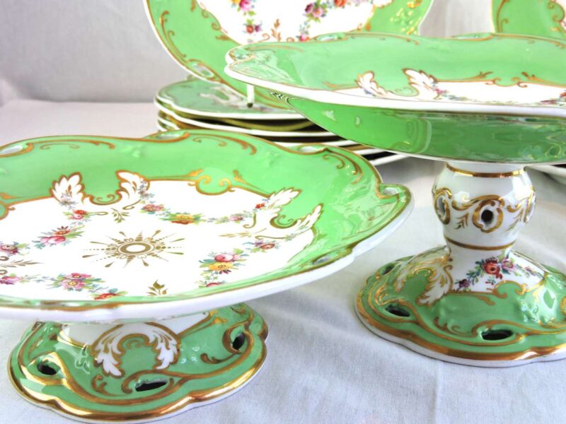 A delightful English hand painted dessert set, dating circa 1870. The set is a joyful blend of apple green on white, with floral and gold leaf accents. The pieces have a simply unique and whimsical shape and design, giving it a timeless character that reminds one of a ‘Mad Hatter Tea Party’.