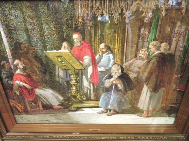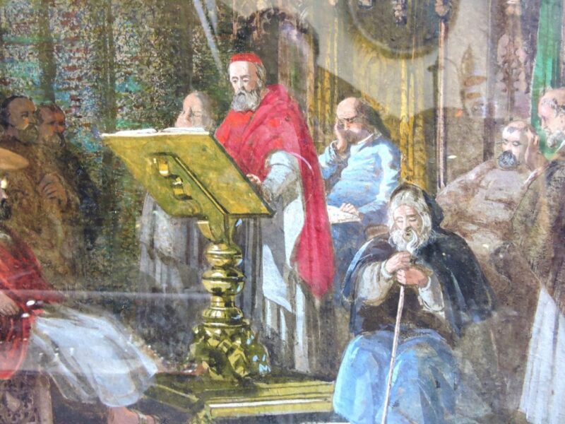 Interior of a Gothic church where the Bishop is reading a lesson from a lecturn with others seating around listening.