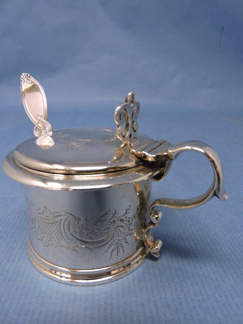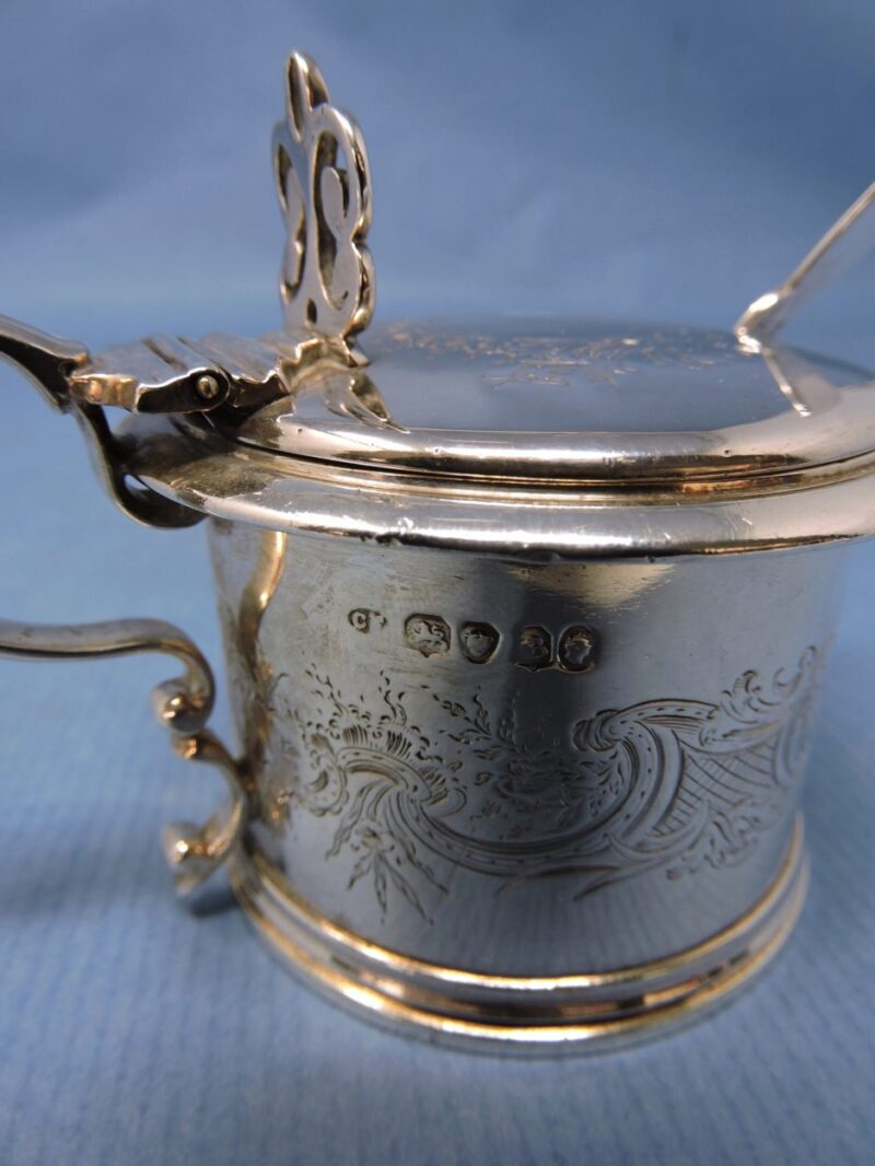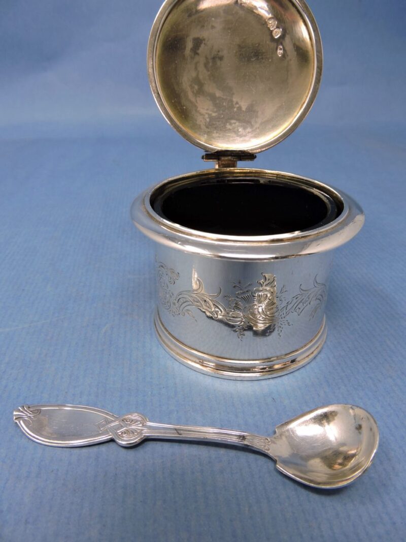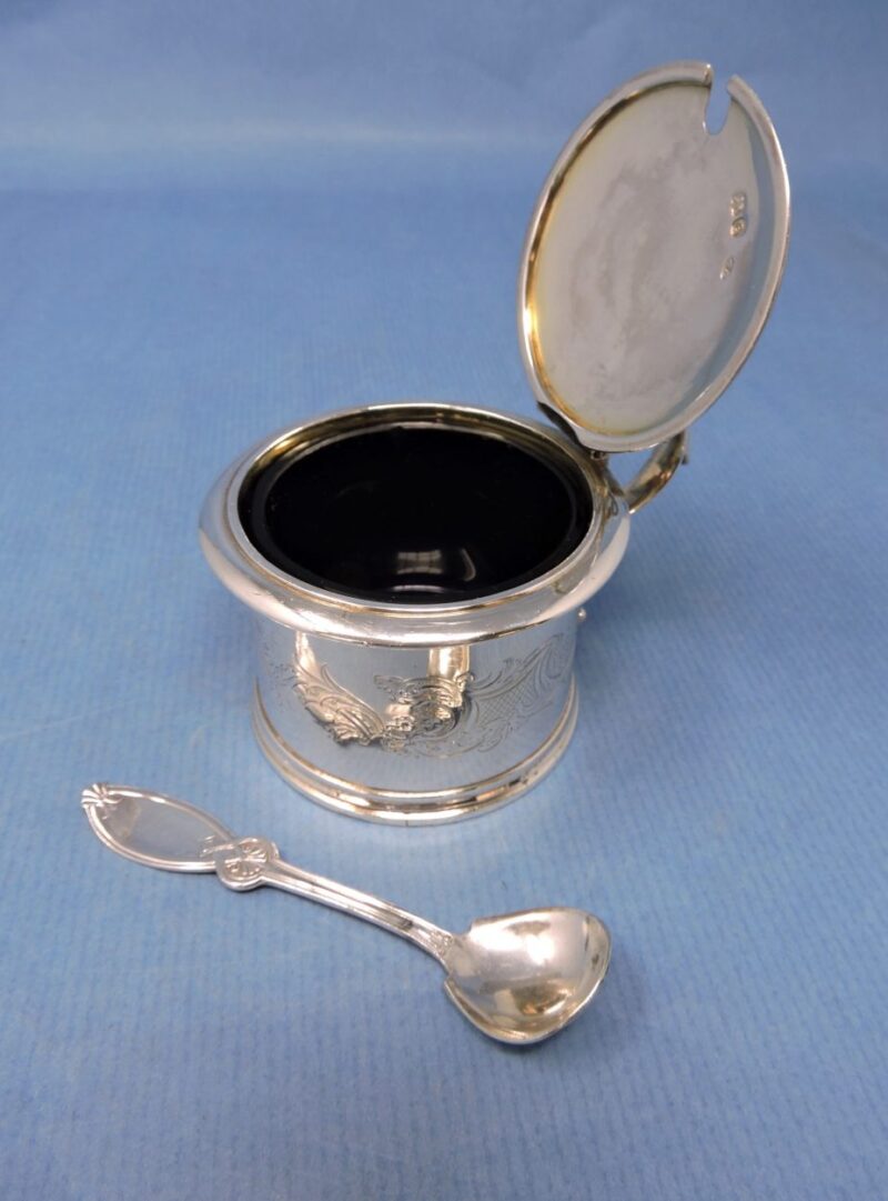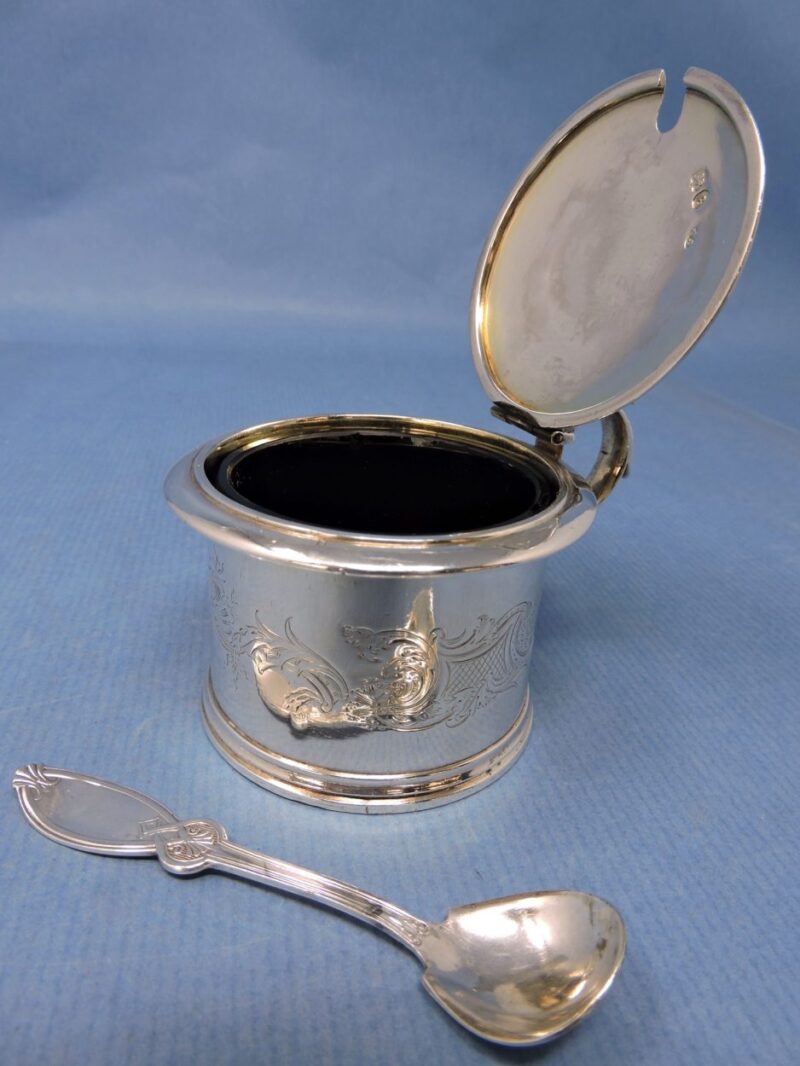 A wonderful English hallmarked (London 1837) engraved sterling silver mustard pot by Chas. Fox with a cobalt blue glass liner and a silver-plated 1847 Rogers. Bros. spoon.