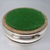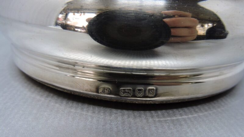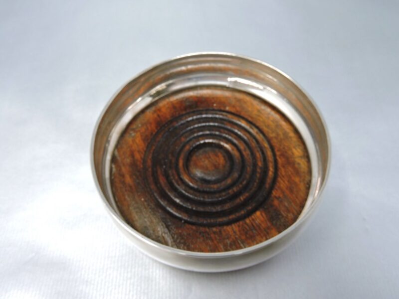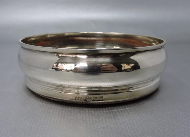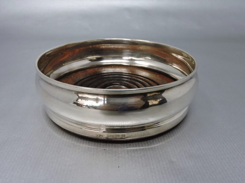 A lovely single sterling wine coaster with wood base and felted bottom.  English hallmarks for London 1973.