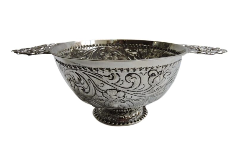 An English hallmarked sterling Quaich (wine, scotch or brandy taster) with hand chased design throughout.  Handles are quite decorative.  The Quaich derived from Scotland has 2 handles which was a sign of friendship when drinking.