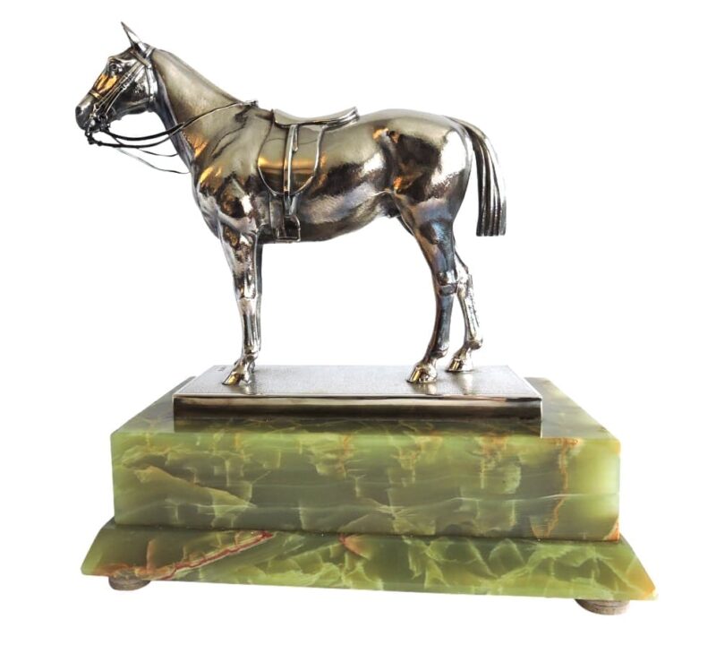 v** SOLD ARCHIVES **vAn unusual Sterling Silver mode of a race horse – sculpture by Goldsmiths & Silversmiths Co ltd of London, England. The race horse is may be a model of Blue Peter – a British Race Horse who had won four consecutive races in 1939 and who’s career was cut short due to the onset of WWII. The sculpture sits upon a beautiful vibrant green onyx base.
