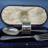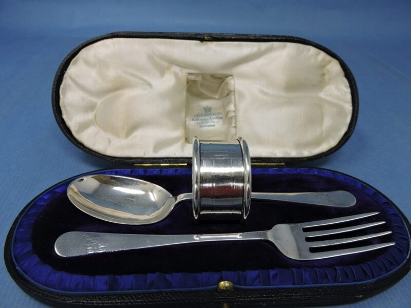 English Hallmarked Sterling Silver Child’s Cutlery Set (Fork, Spoon and Napkin Ring) by J. Sanderson & Son, Dated 1948, in Original Leather Box