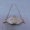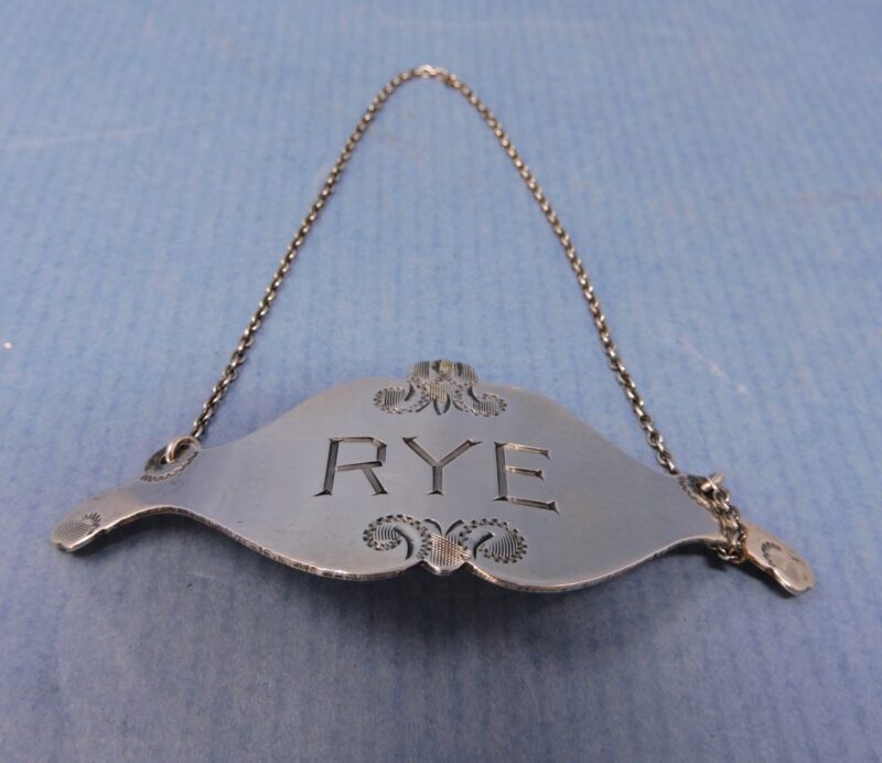 An English hallmarked sterling silver rye whiskey decanter label with chain. The front of the label is engraved with the word “RYE” and some decorations. The back of the label shows the word “Sterling” as well as the hallmarks.