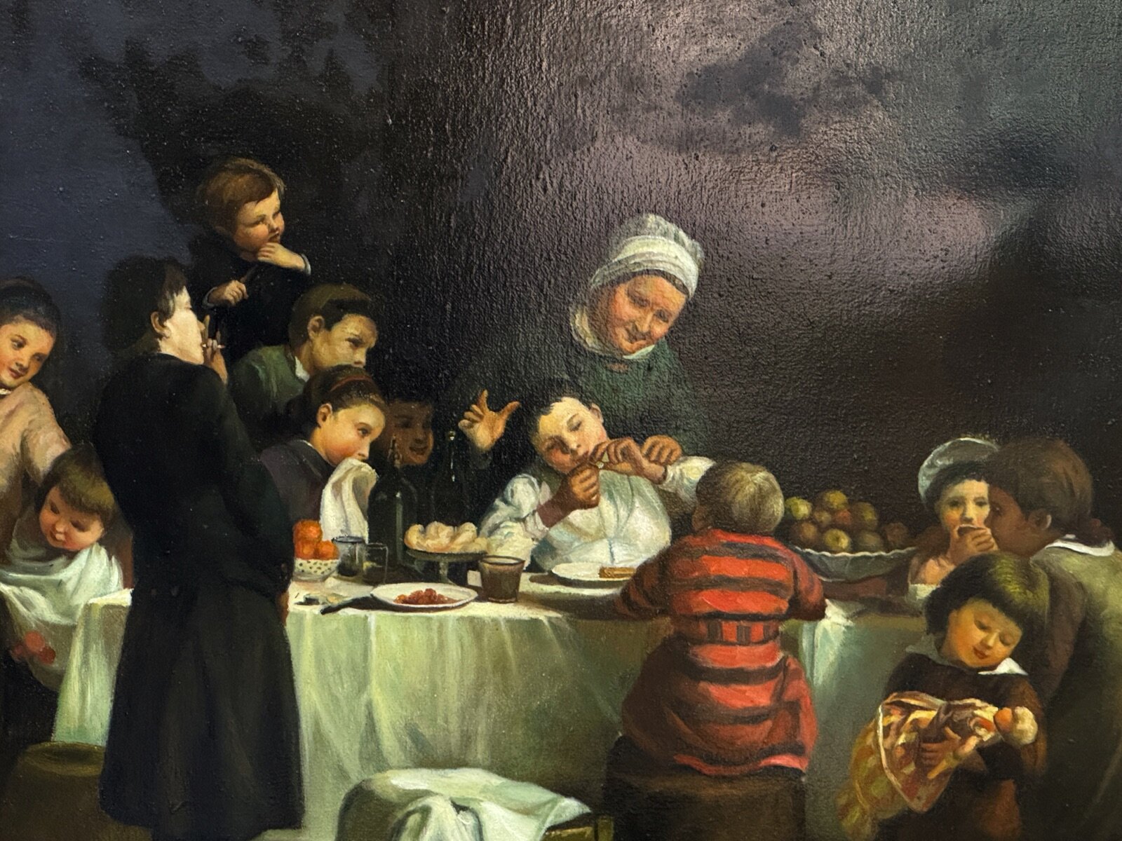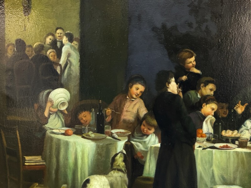 English Large Scale Mid 20th Century Oil Painting “The Children’s Dinner Party” by Nora Bingham, After 1868 English Victorian Masterpiece by Thomas Webster