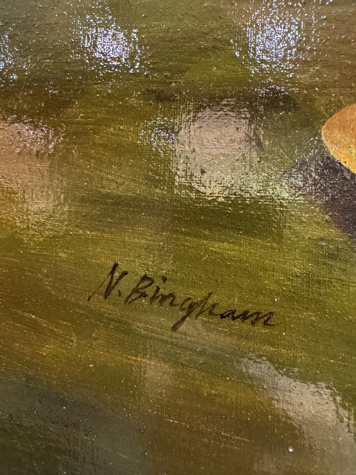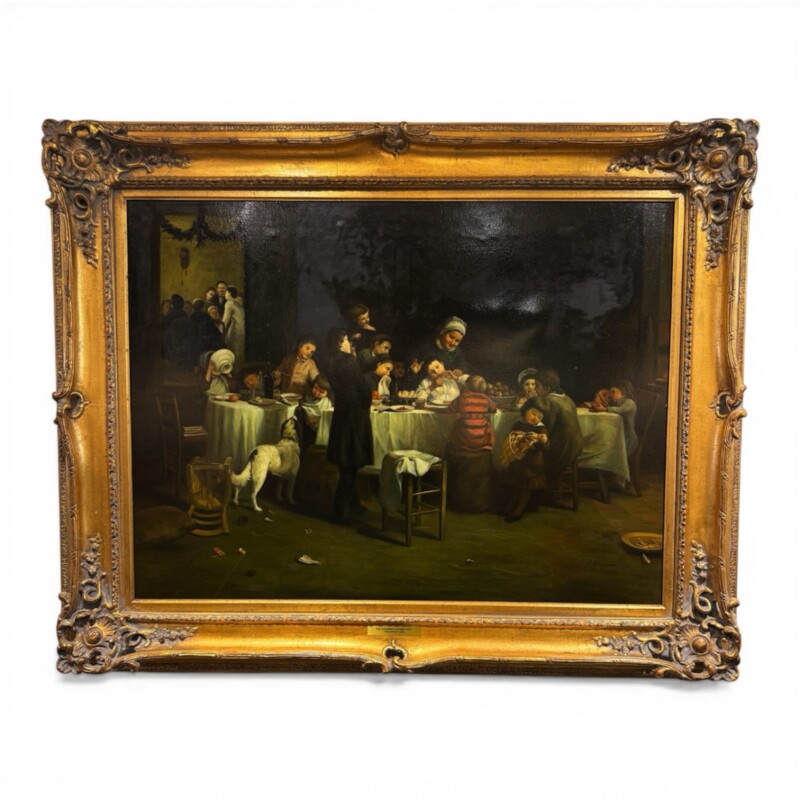 While the original masterpiece by Thomas Webster was a landmark of Victorian genre painting, this specific canvas is a mid 20th-century recreation by Nora Bingham (active c. 1950s–1980s). Bingham was a noted English painter commissioned to produce museum-grade copies for grand estates and traditional galleries, known for her ability to capture the specific “soul” and brushwork of 19th-century masters. The painting is housed in a magnificent and deeply carved gilt wood and composition frame, featuring ornate shell, scroll, and acanthus leaf motifs that provide immense presence and traditional elegance. This impressive statement piece is clearly signed on the lower right and identified by a formal brass title plaque on the lower frame edge, noting the artist’s English origin. In excellent condition with vibrant pigments throughout, this large-scale work serves as a commanding focal point for a grand dining room, library, or traditional hallway.