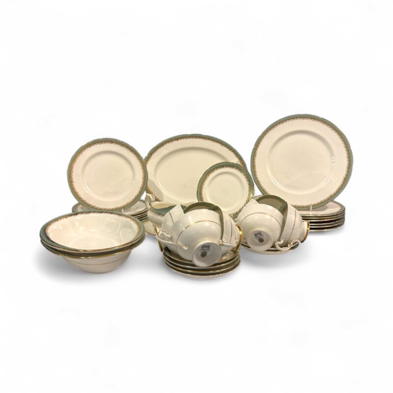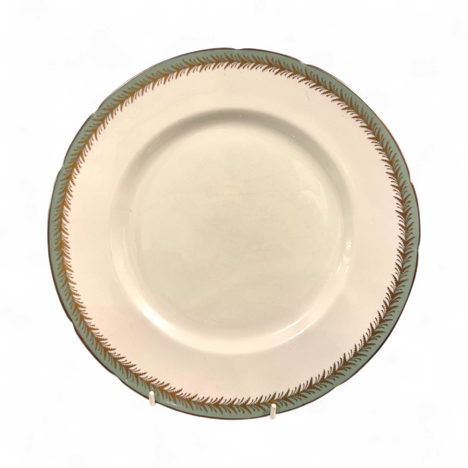 China PatternsThis Paragon dinner set for 6 in pattern # Z1557 features a gorgeous sage green band with a delicate gold, fern-like frond design and is trimmed in gold on the rims.