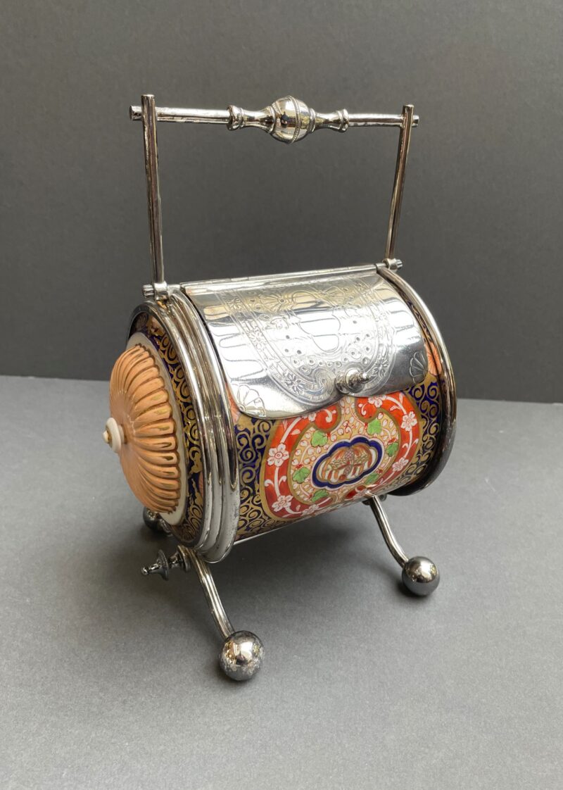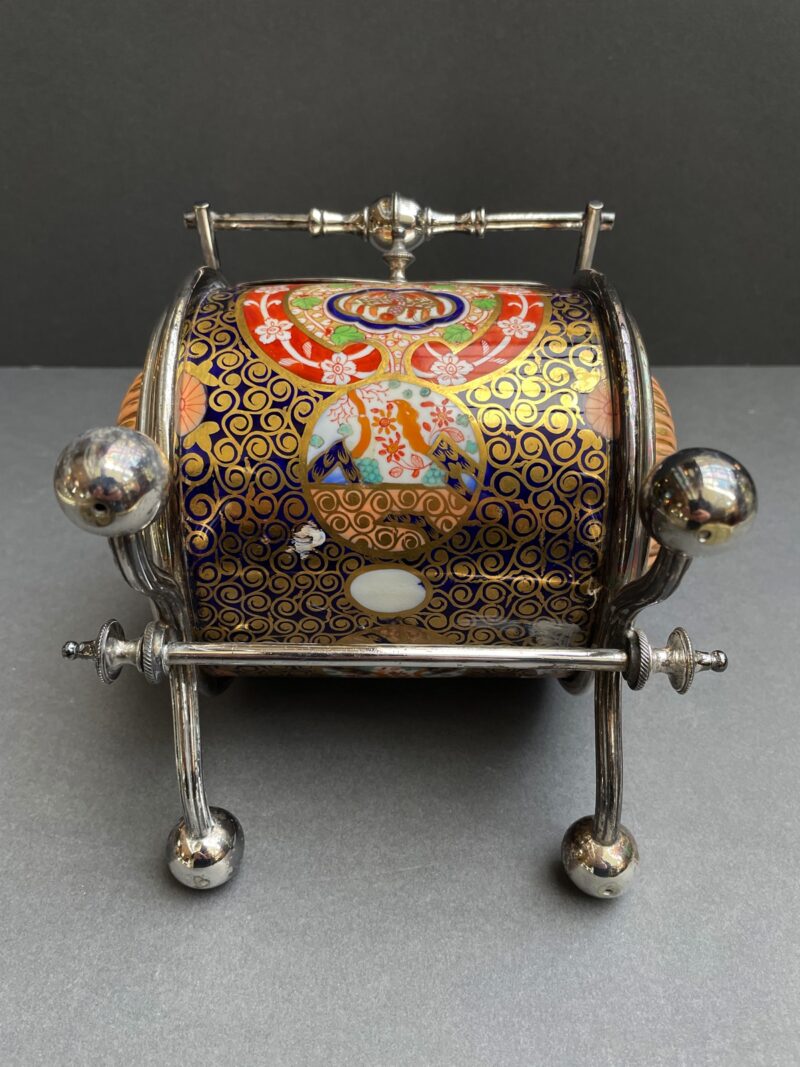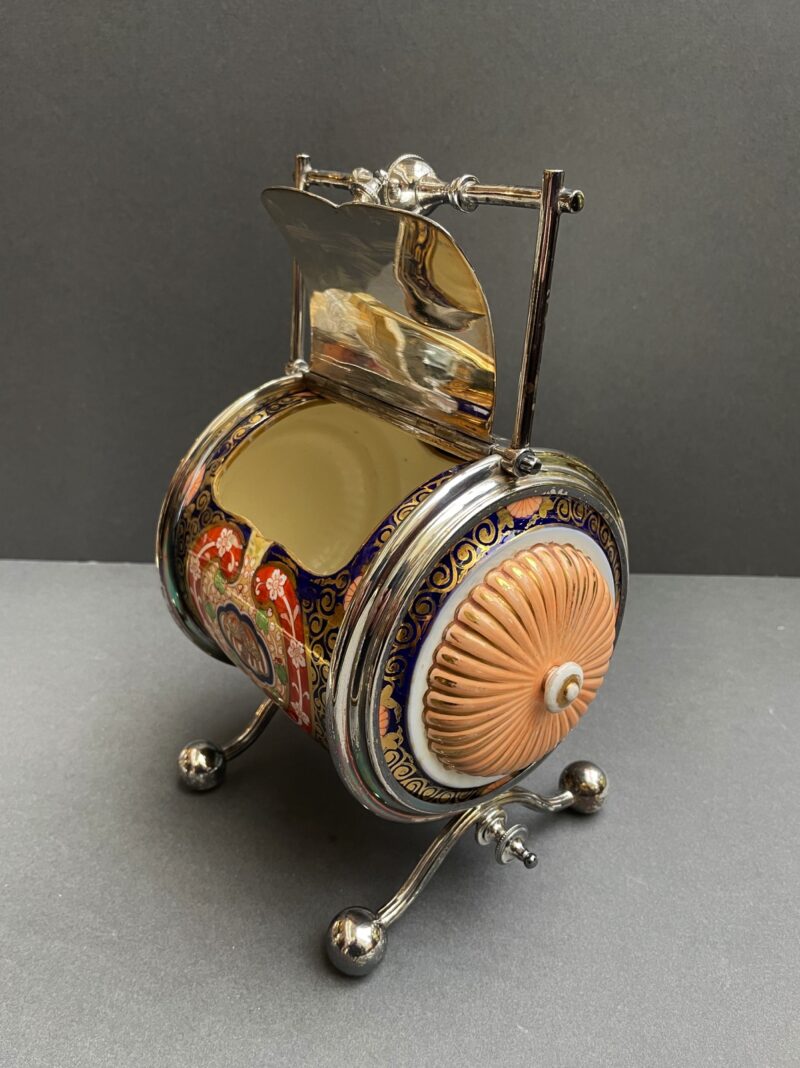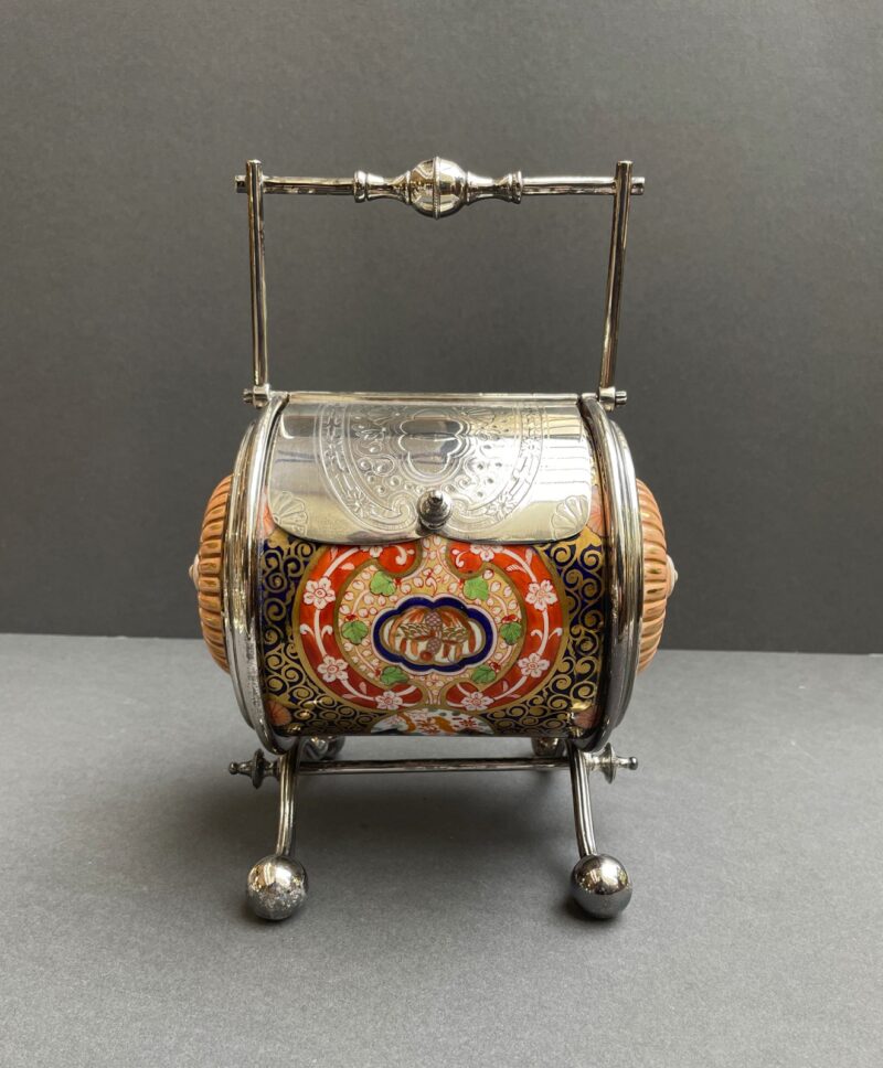 English Porcelain & Silver Plated Barrel Shaped Biscuit Barrel in Imari Colours – circa 1890. Walker & Hall English marks.