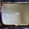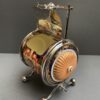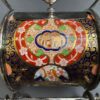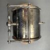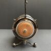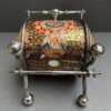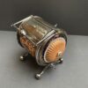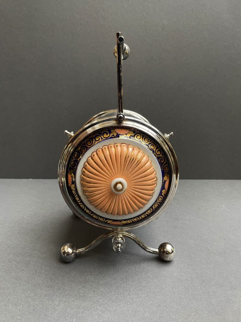 v** SOLD ARCHIVES **vA rare barrel shaped porcelain biscuit barrel in hand painted Imari colours of gold, rust red and blue. The barrel is surrounded by silver plate handle (hinged), 4 feet with cross brace and two silver plated lids that each open separately. The ends are lid shaped and reeded with a knob/finial in a salmon pink colour reminiscent of Davenport porcelain. The silver plate is marked for what looks like W&H S in pseudo silver hallmarks and ‘EP’ with crown above – which would be for Walker & Hall, England.