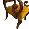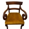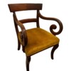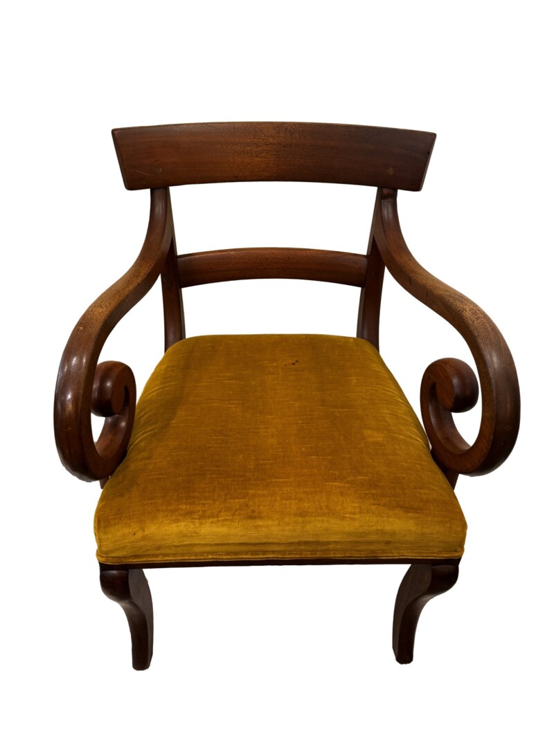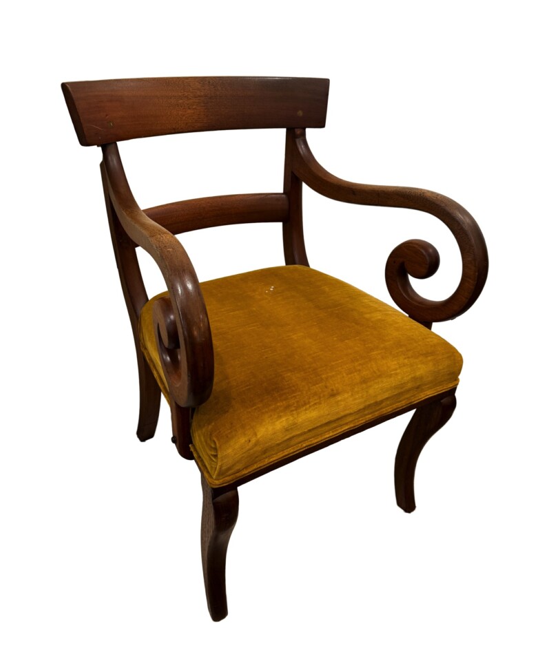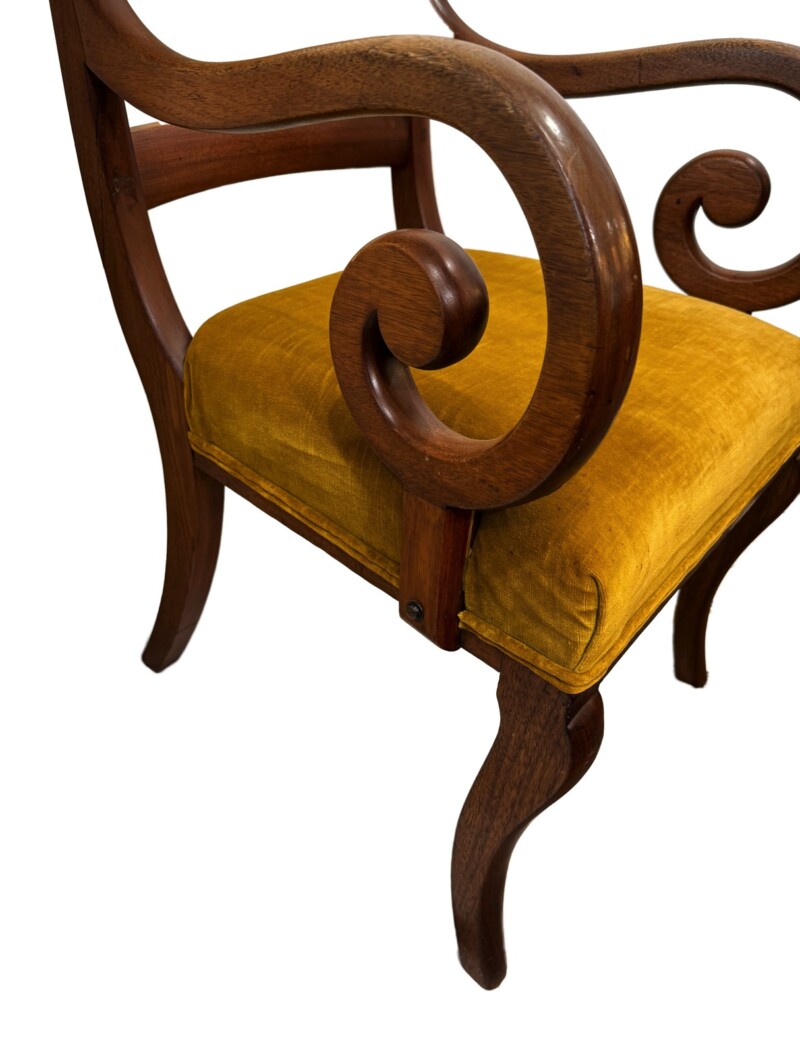 This handsome English Regency mahogany armchair, circa 1820, has scrolling ram’s horn arms and bowed crest and lumbar rails. The sweeping back legs are beautifully balanced with the gracefully shaped front legs. The yellow ochre velvet apholstery and the aged patina and colour of the mahogany make this a very striking chair.