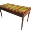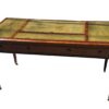 v** SOLD ARCHIVES **vA handsome green leather topped desk in mahogany from the Regency period, England, circa 1830. The desk has panels of leather on top – the centre one lifts up on an angle and the angle is adjustable to many angles by two arms that are supported by notches inside the table top. The front shows 3 drawers with round brass hardware – the drawers pull out and run the full depth of the desk. The backside shows 3 fake drawers – so the desk can be placed anywhere in a room – not just against the wall.