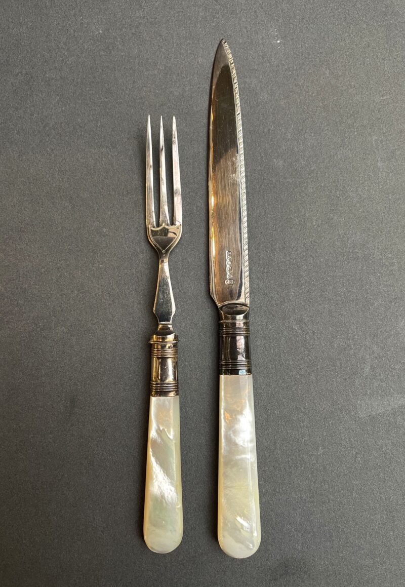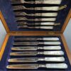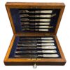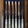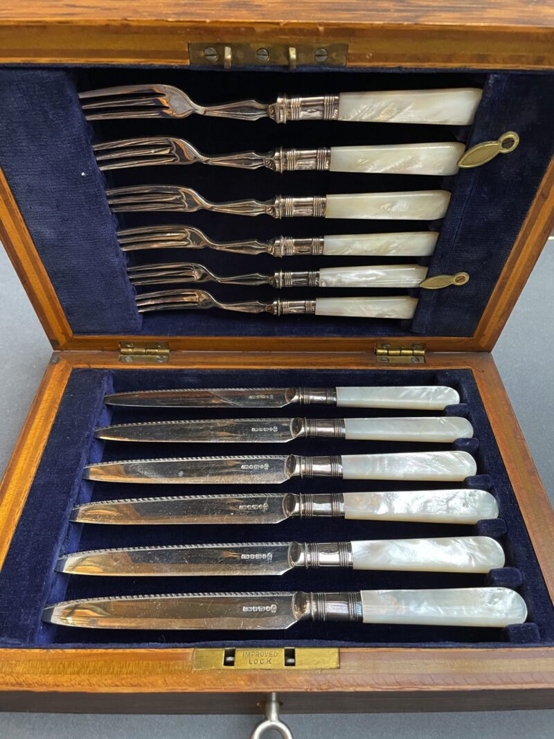English Silver Plate & Mother of Pearl Fruit Set in Oak Box – Set for 6 (12 pieces) – circa 1900