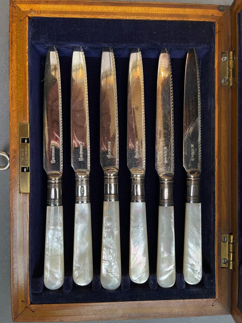A lovely fruit set for 6 with mother of pearl handles and silver plated blades in a custom fit oak box.