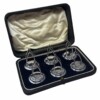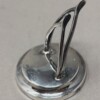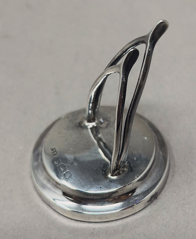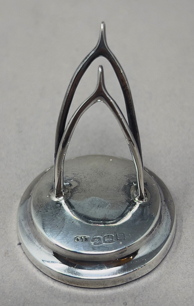 These fine antique George V sterling silver place card or menu holders are a set of 6, each with a circular shaped bases and an impressive linear wishbone* design. The subtly convex bases are weighted and have an elevated circular platform holding the sculptural “wishbones” and hallmarked Birmingham, 1911. This impressive set of 6 is fitted to the original hinged leatherette box with satin and velvet lined interior. A conversation piece for any table, may your wishes come true!