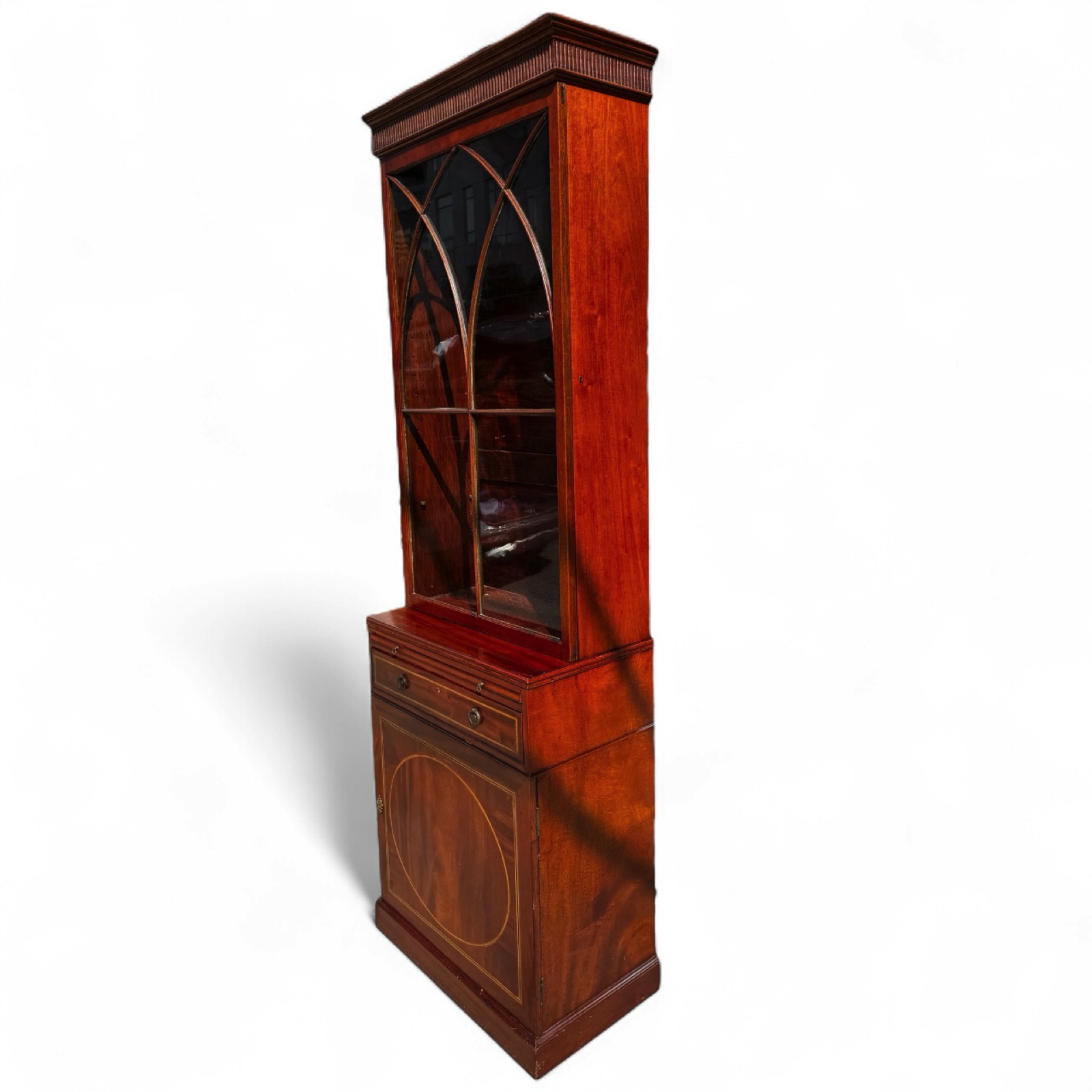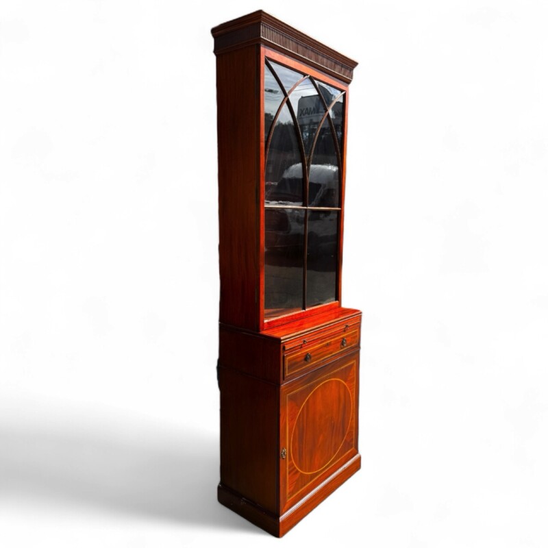 FurnitureEnglish mahogany two-piece display curio cabinet. The upper display has a single glass door, artistically divided with patterned wood mullions and a key lock located on the side panel. Inside there are 3 adjustable shelves. The bottom portion of the cabinet has a pull out shelf for organizing, a large full width drawer, all supported by a large lower storage cabinet. The lower single solid mahogany door is inlaid with a wonderful satinwood large oval shape.
