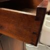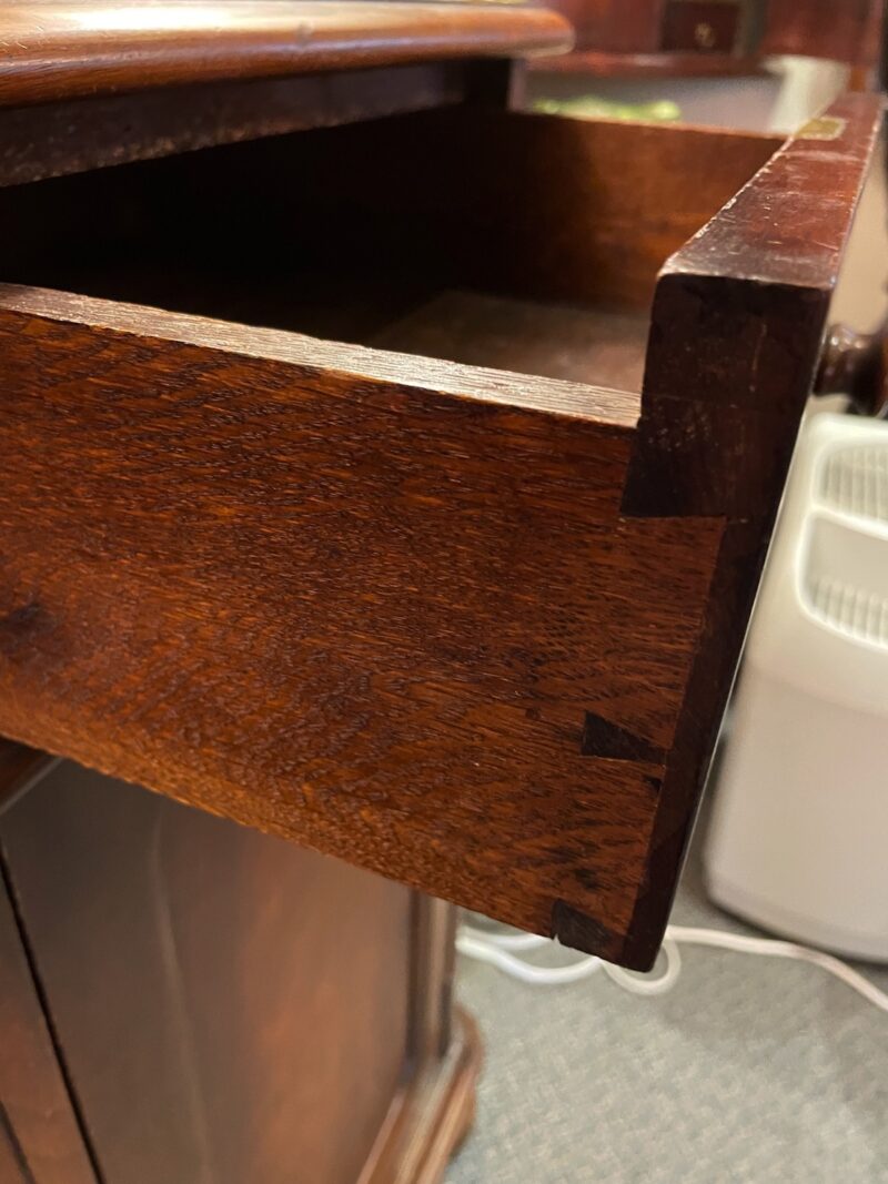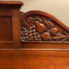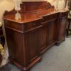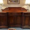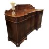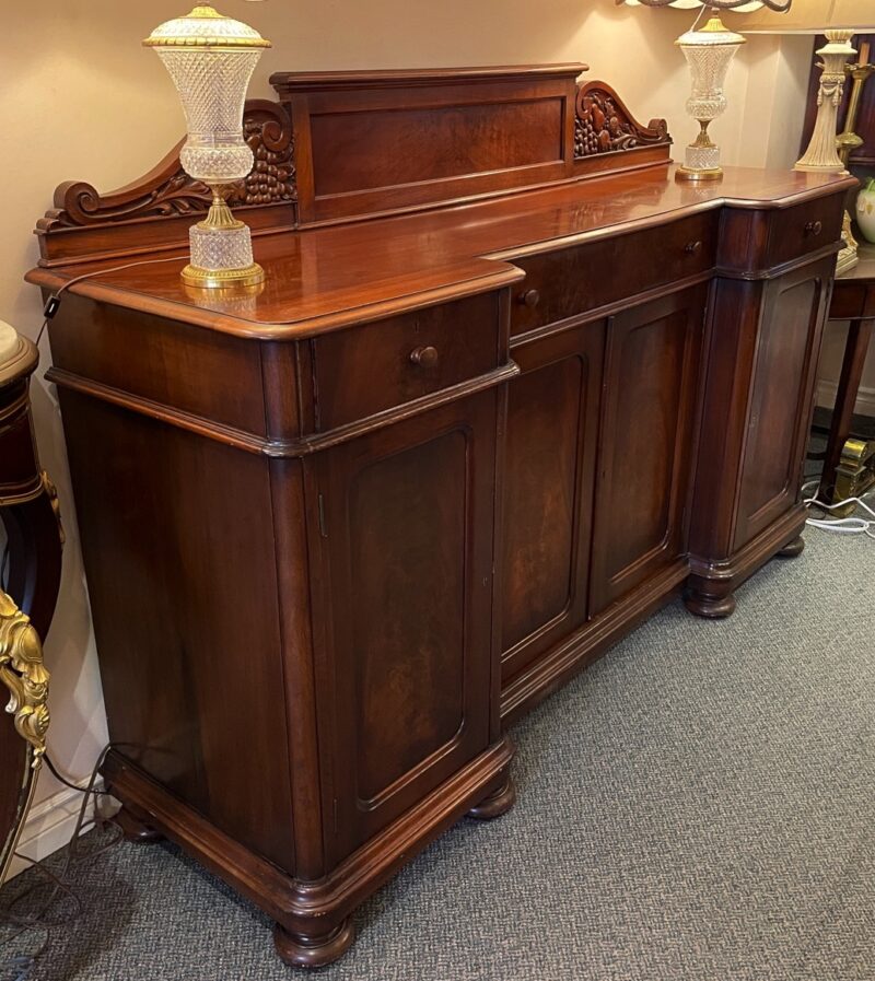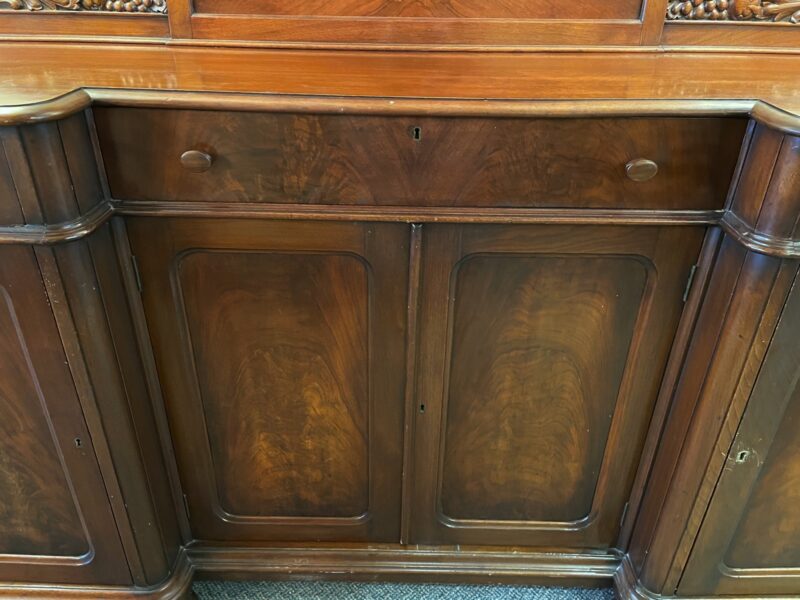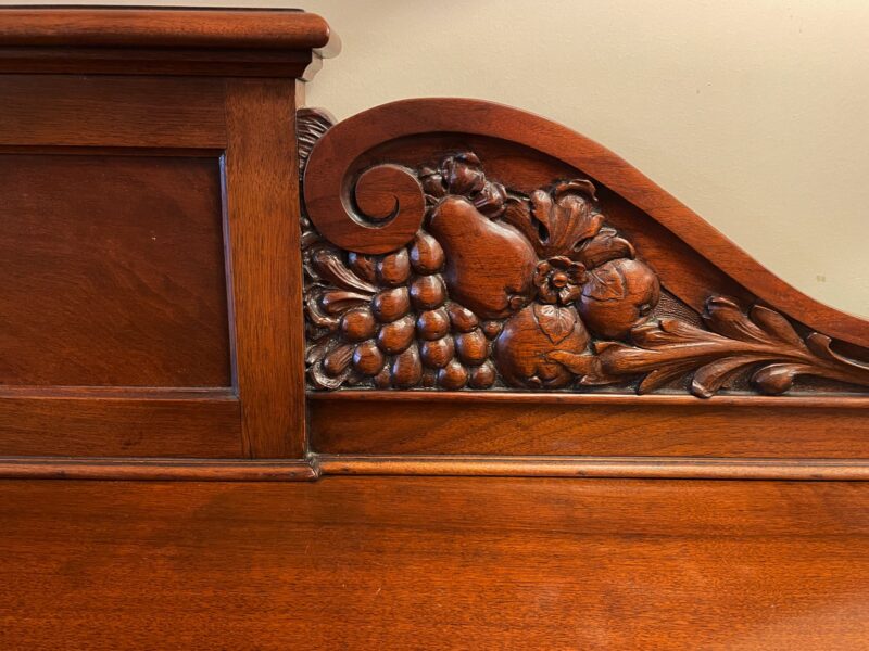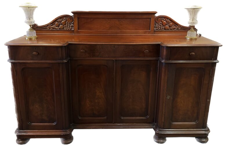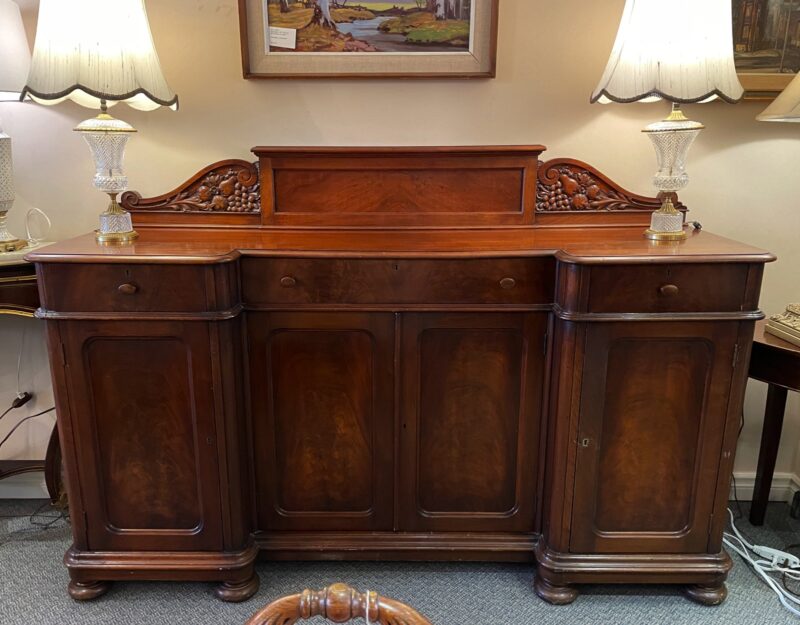A handsome William IV style mahogany buffet with backboard that has hand carved fruit motif ends.  The buffet has a great deal of storage with 4 doors that open with each having shelves or drawers inside.  There are also 3 cutlery drawers on above each door – 2 singles and 1 extra wide.  Hand carved fruit decorates each end of the backboard, otherwise the buffet is very plain.