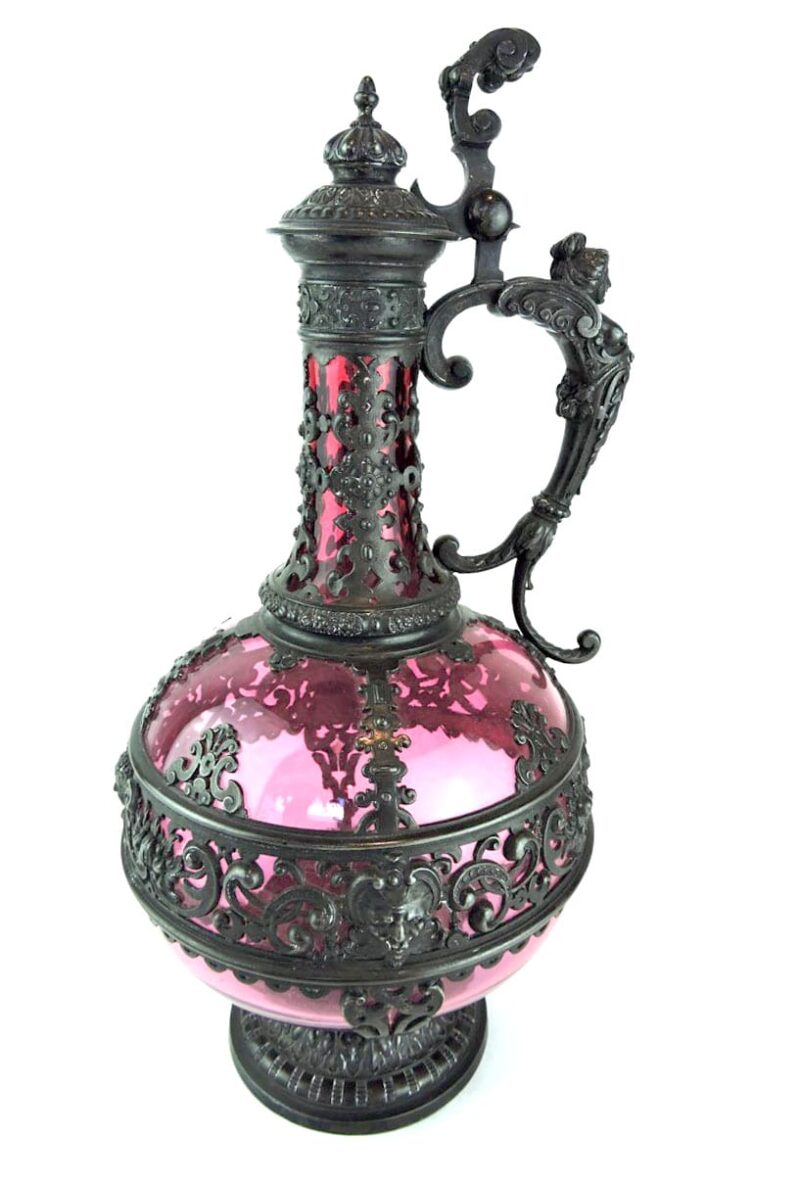 European Cranberry Glass and Elaborately Decorated Pewter Claret Jug – c. 1870