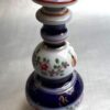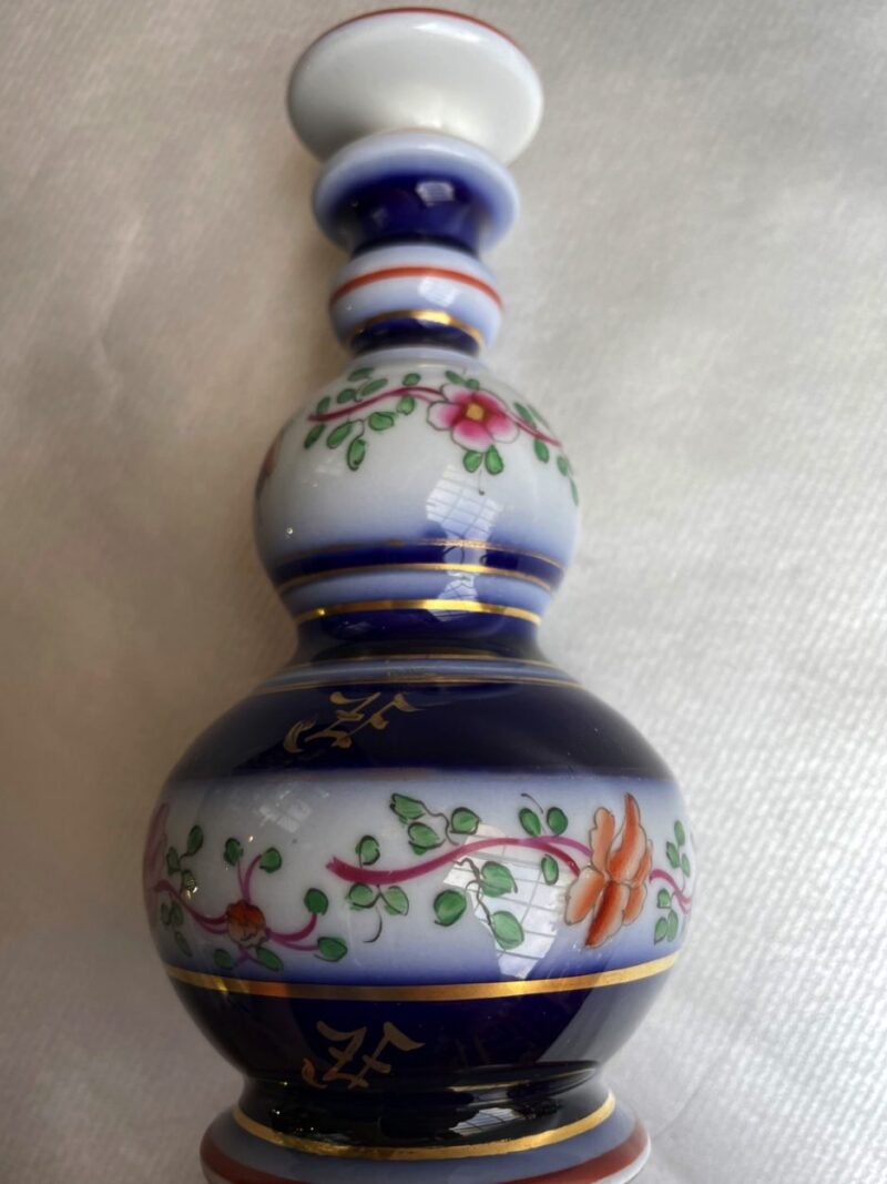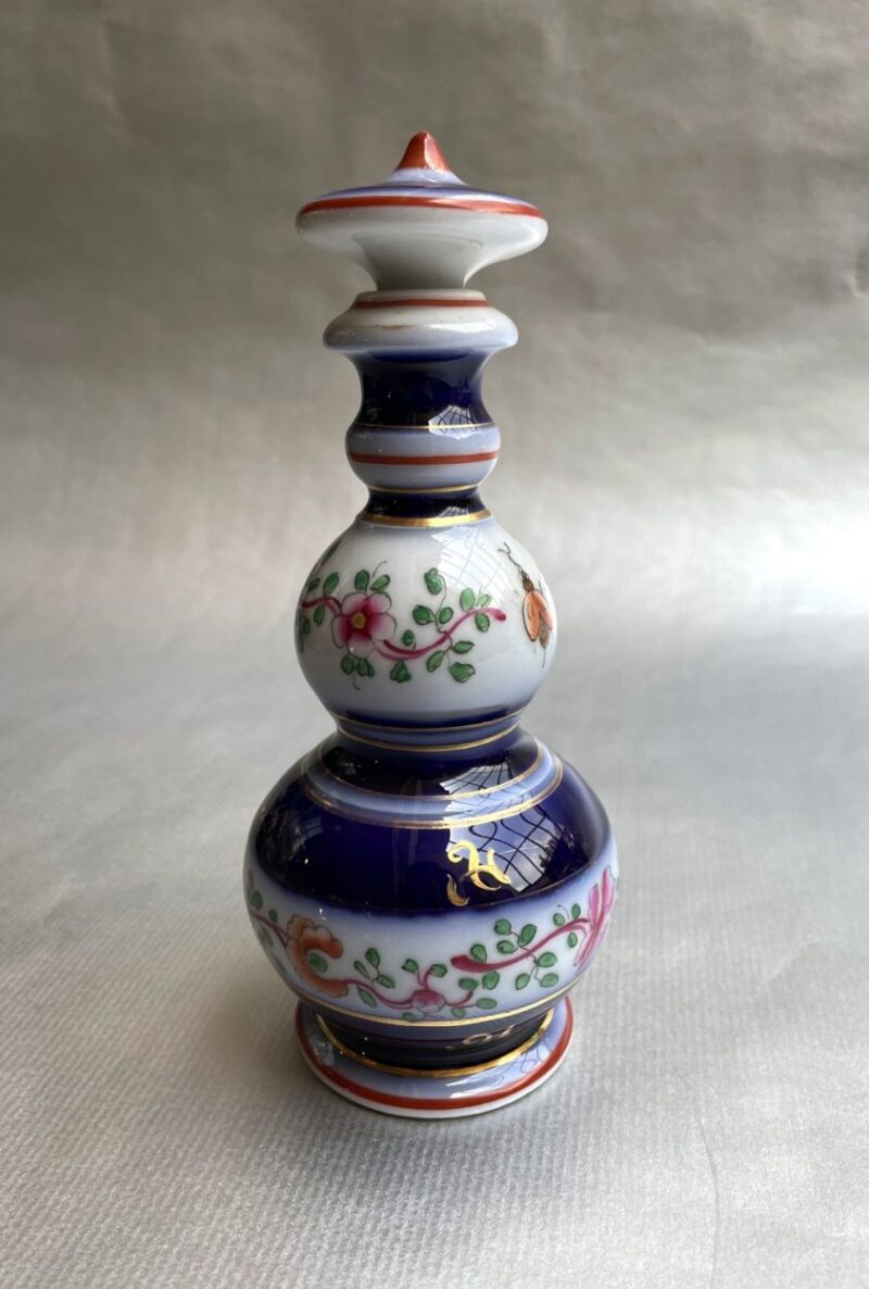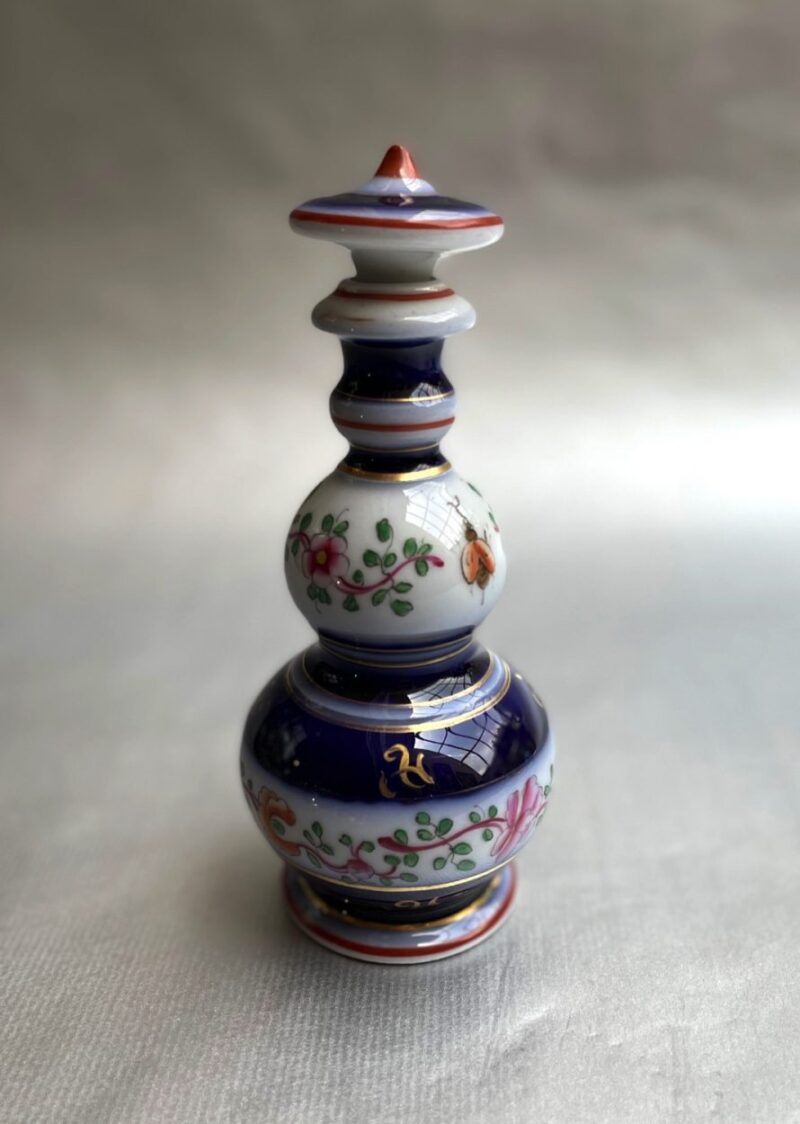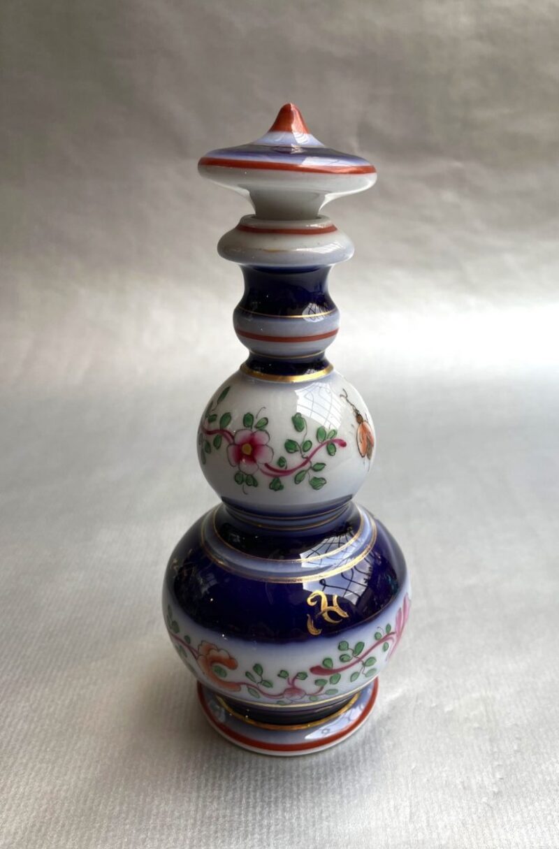 A lovely 19th century (c. 1860) European porcelain perfume bottle with removable stopper. The bottle has a white background and is decorated with cobalt blue, gold and orange and with flowers and insects.