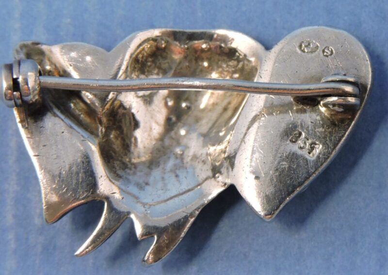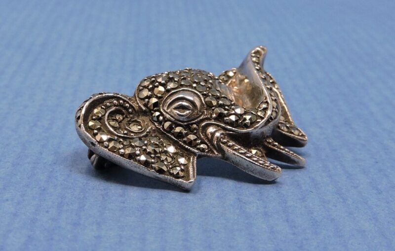 An adorable .835 European silver brooch of an Elephant’s face, trunk and ears, decorated all over with shiny marcasites.