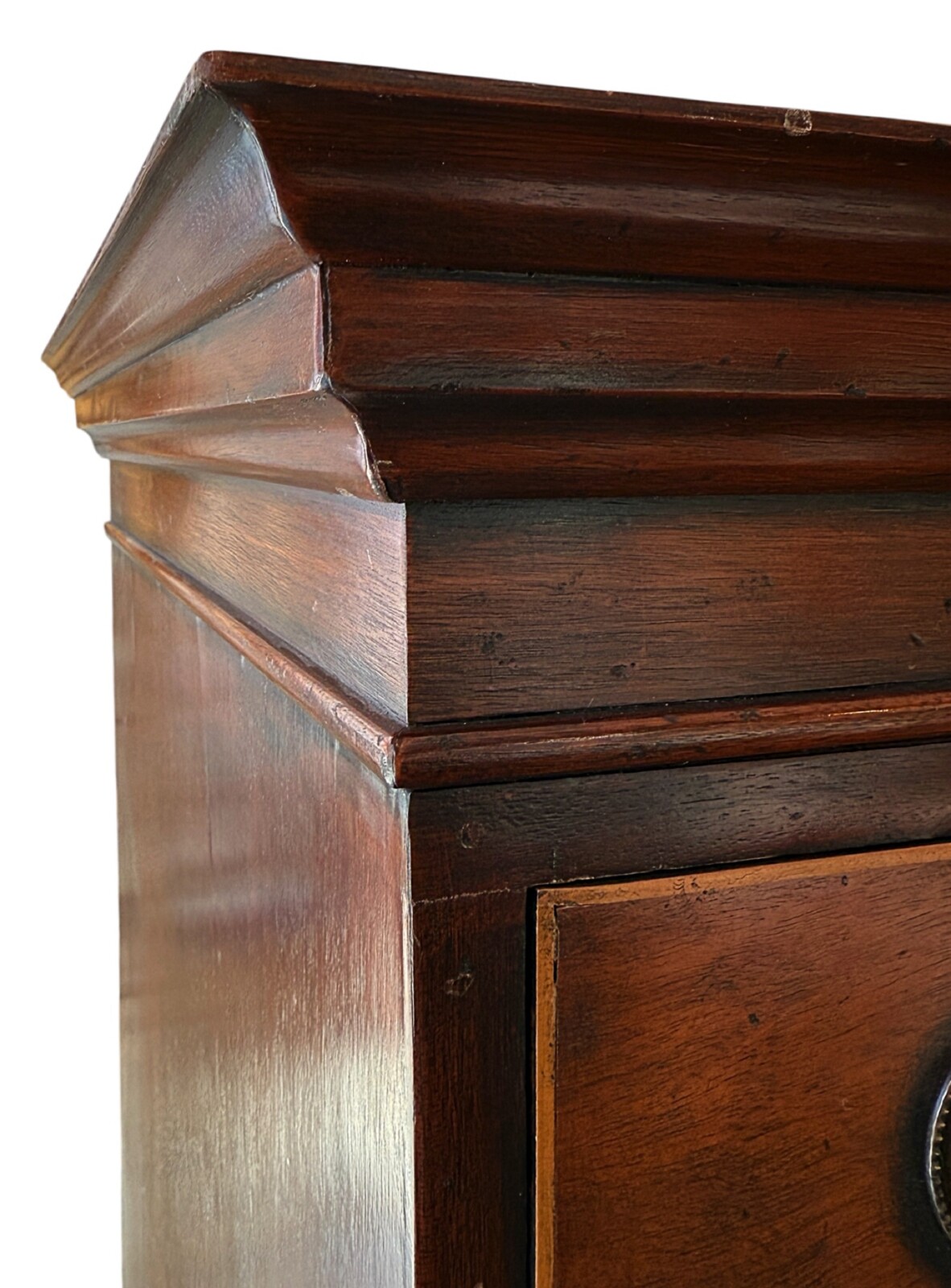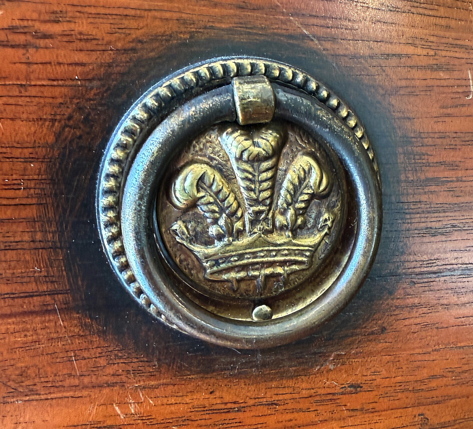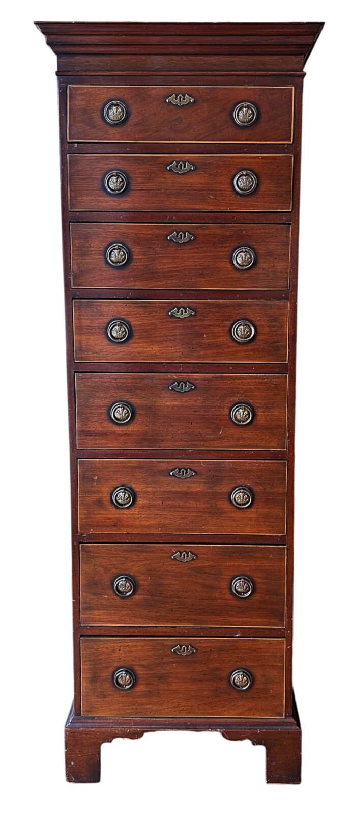 FurnitureExceptional English/Irish, 8 graduated drawer Tallboy chest, dating to George III – late 18th century. The moulded bordered top surface is dove-tailed to the sides which is seen in some Irish cabinetry. Each drawer is trimmed with satinwood and has brass pull hardware, each with a stamped brass medallion of the Prince of Wales crown and ostrich plumes. The Georgian tall bracket feet complement the top moulded border.