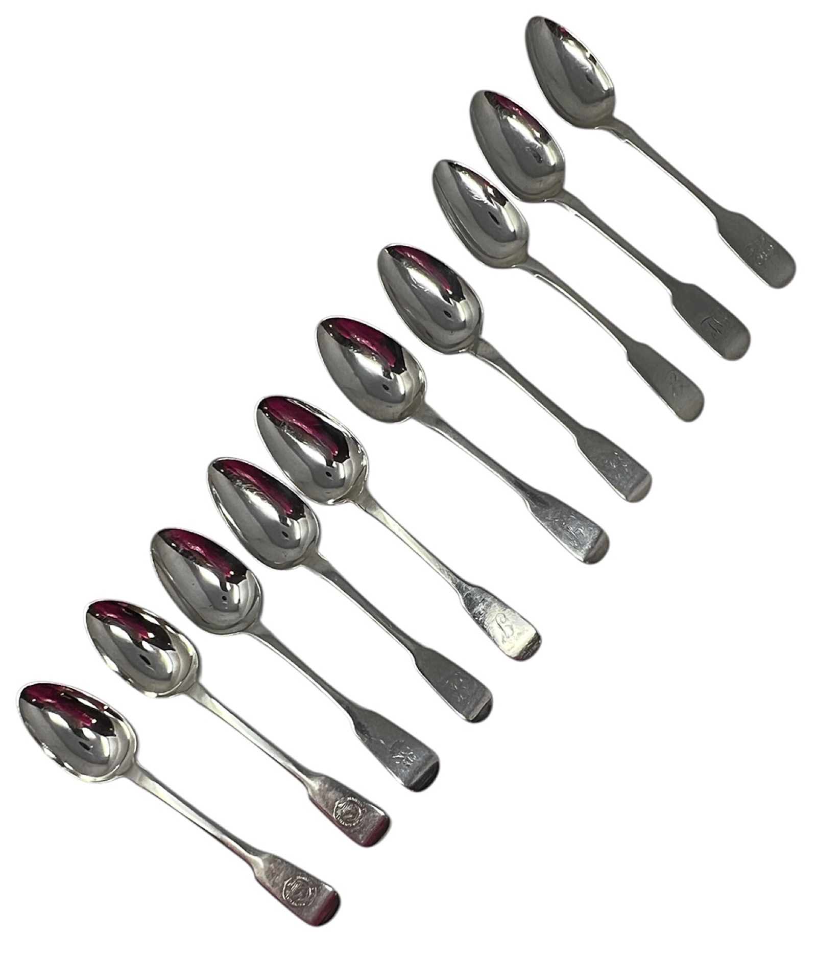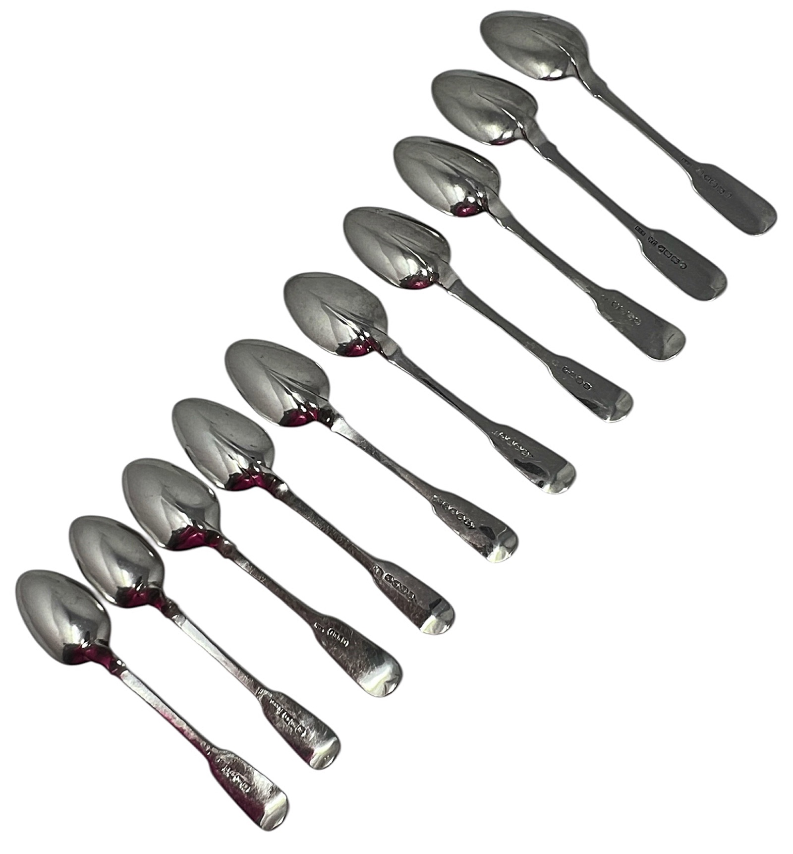 Exceptional Irish Sterling Silver Collection of TEN Early 19th Century, Tea Spoons, Fiddle Pattern by 4 Prominent Dublin Makers, 1825-1843