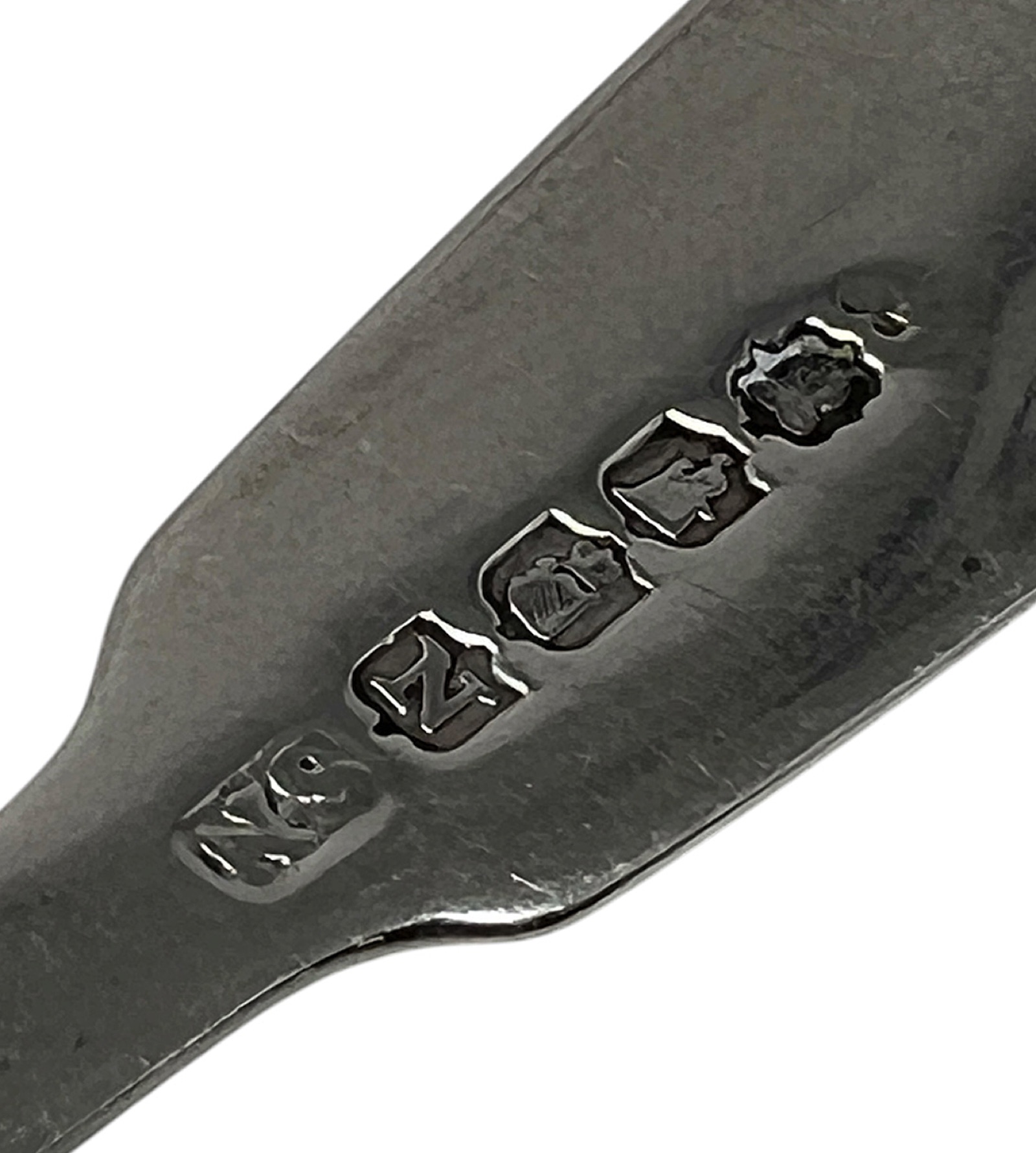 The spoons are unified by the classic Fiddle pattern, a quintessential design of the 19th century known for its elegant, violin-shaped handles and substantial weight. Measuring between 5.75 and 6.25 inches, these pieces offer a refined balance and a clean, architectural aesthetic. Each spoon is struck with a comprehensive set of Irish hallmarks, including the Crowned Harp (standard mark), the seated figure of Hibernia (Dublin city mark), and the monarch’s head duty mark, alongside the specific date letters and makers’ initials.