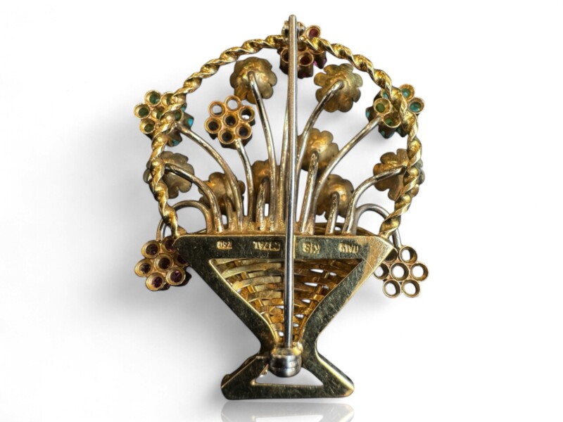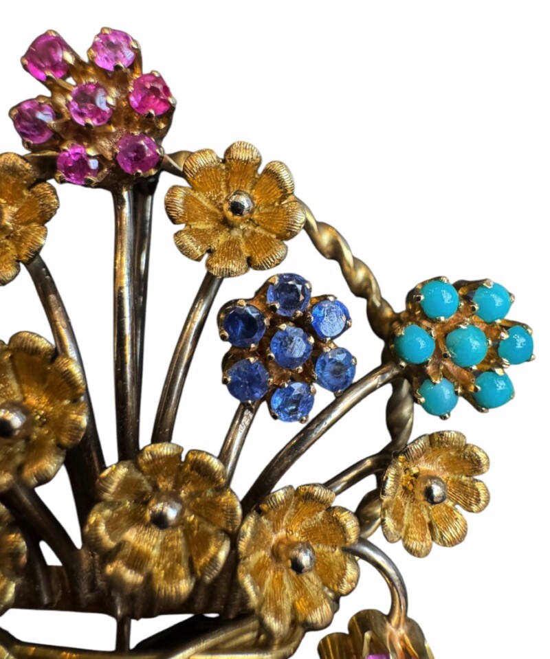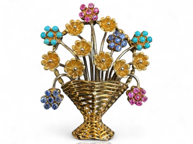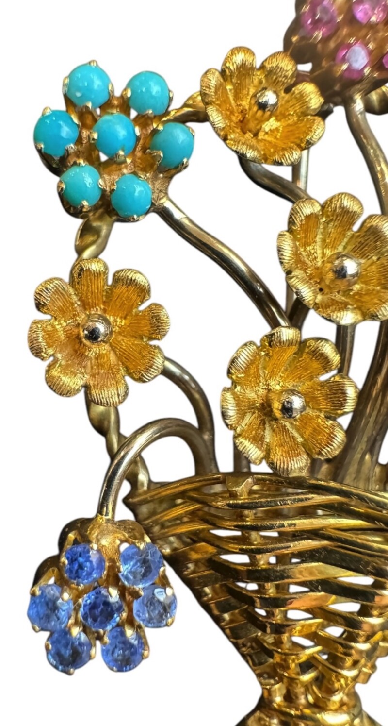 Exceptional Italian Jewelry by Designer Aldo Garavelli 18K Yellow Gold & Multi Gemstone Gardinetto (Flower Basket) Brooch, Mid 20th Century