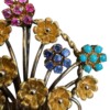 v** SOLD ARCHIVES **vThis exceptional Italian brooch by designer Aldo Garavelli features a beautifully handmade 18k yellow gold “gardinetto” (Italian for flower basket) blooming with an array of fourteen delicate 18k yellow gold flowers. Each of six flowers are set with gemstones that form the “petals”. Two flowers with 7 sapphires each, two flowers with 7 rubies each and two flowers with 7 turquoise each. The under clasp-side of the brooch is marked “ITALY”, “237 AL” trademark for Aldo Garavelli , “750” the purity of “18K” . All in very good condition. An exceptional early Garavelli piece.