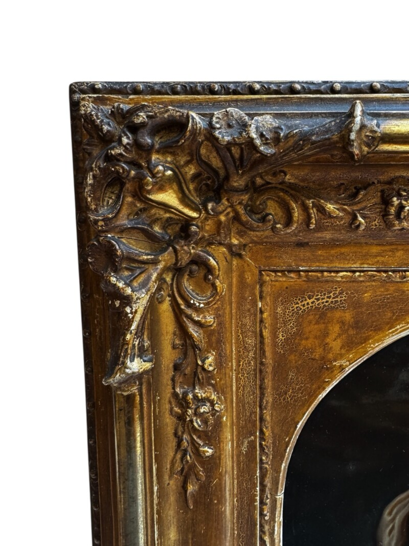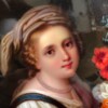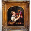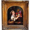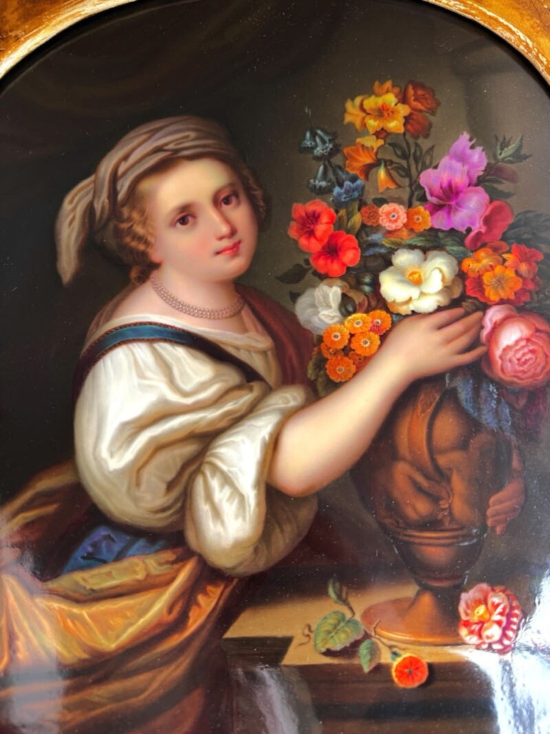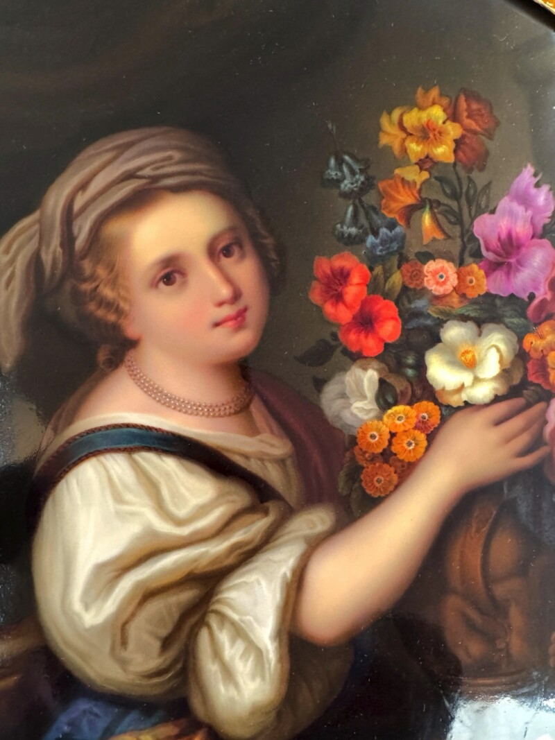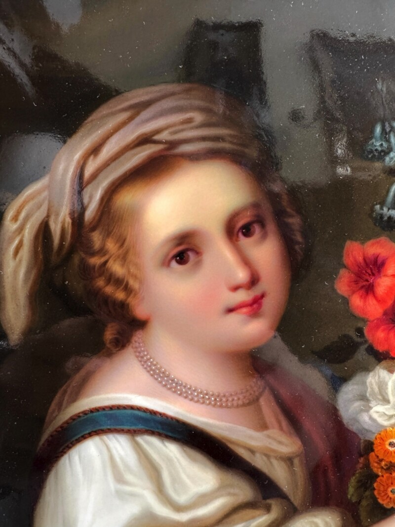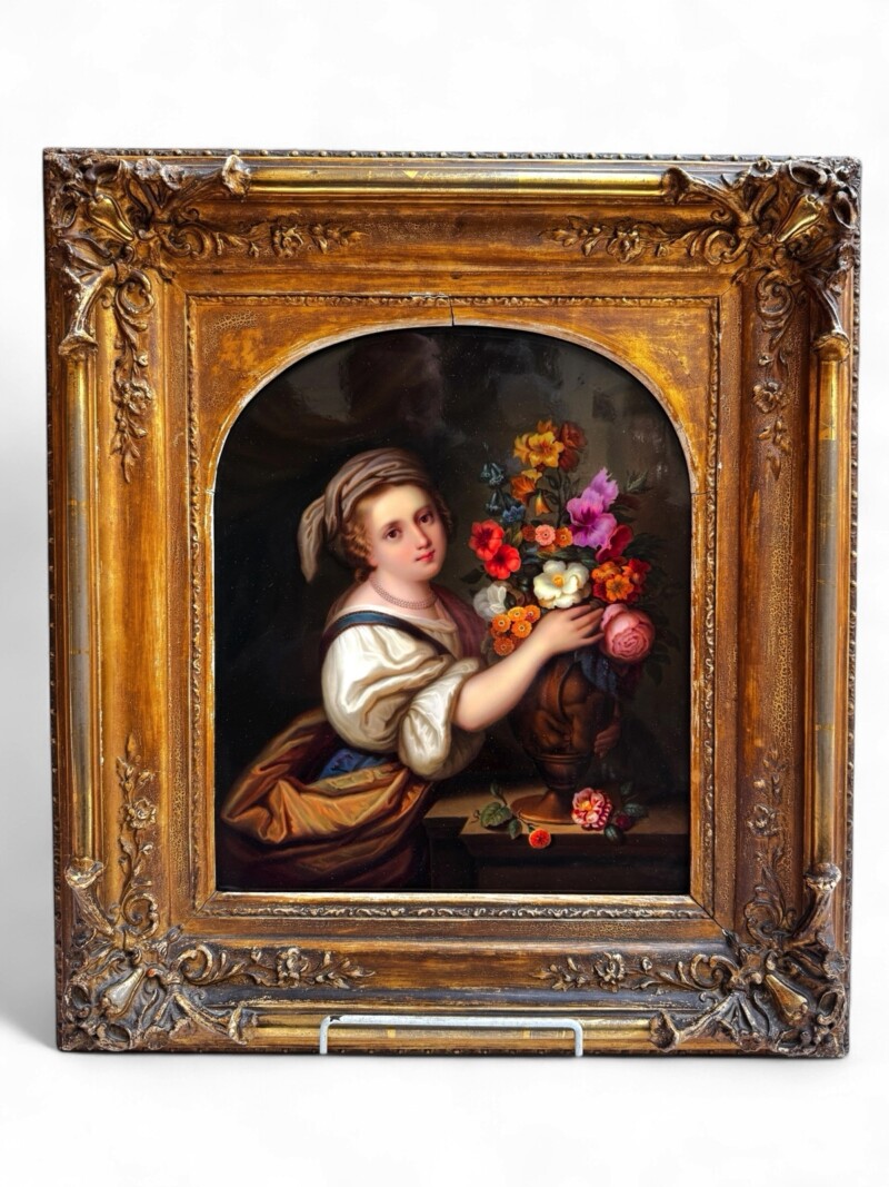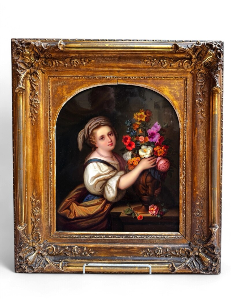Art, PorcelainsFrom Berlin, KPM (Königliche Porzellan-Manufaktur) was the Royal porcelain factory in Germany from the mid 18th century onward. This intriguing portrait of a young girl is hand painted on a KPM porcelain plaque. The young lady is beautifully dressed in luxurious satin fabrics including a head scarf and adorns a pearl necklace. She is in an interior room gazing softly toward the viewer and seems to be interrupted in the midst of arranging the classical vase of flowers. The hand painting has exquisite detail and in excellent condition. The arched frame with decorative moldings of gilt plaster and wood are likely original and in good condition considering the age.