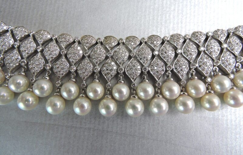 The choker contains 1450 round brilliant bead set diamonds and 41 round adhered even cultured pearls (7.0 to 8.0 gauge).  All set in 18k white gold.