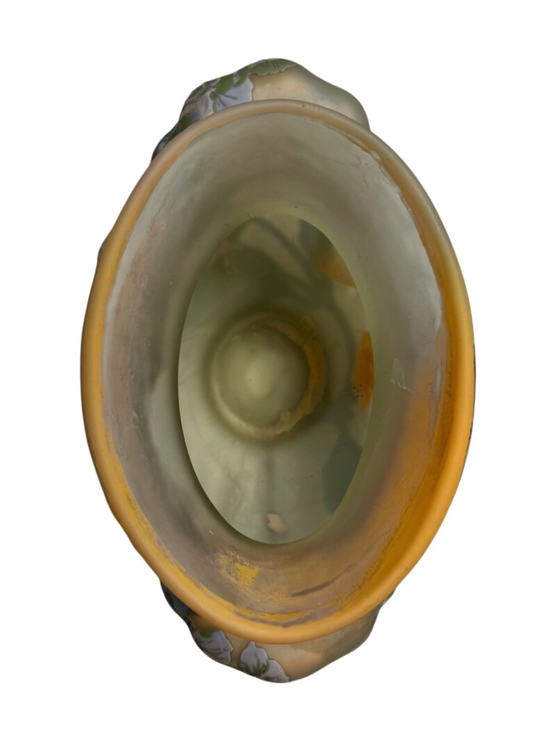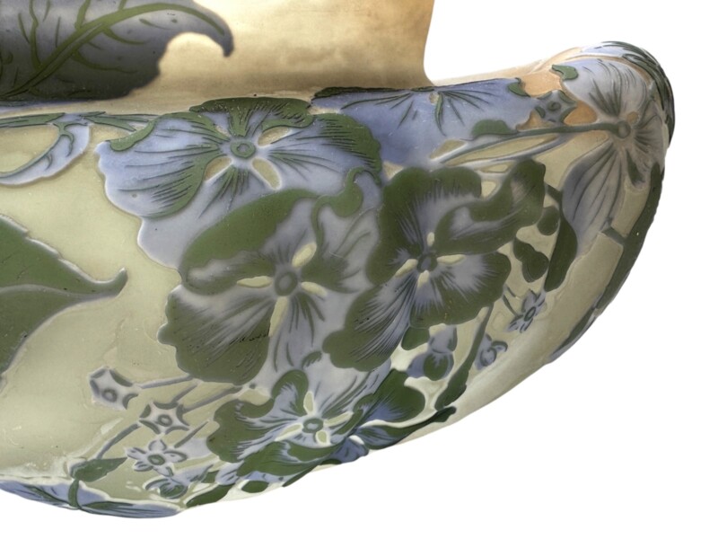 The upright boat shape on an oval neck piece with a slightly flared rim has hydrangea decoration acid etched in violet and green, in various stages or overlay layers. Cameo signature “Gallé with a “star” is on the side of the lower half. This “star” is the standard Gallé mark used on vases that were made after the death of Emile Gallé 1904.
