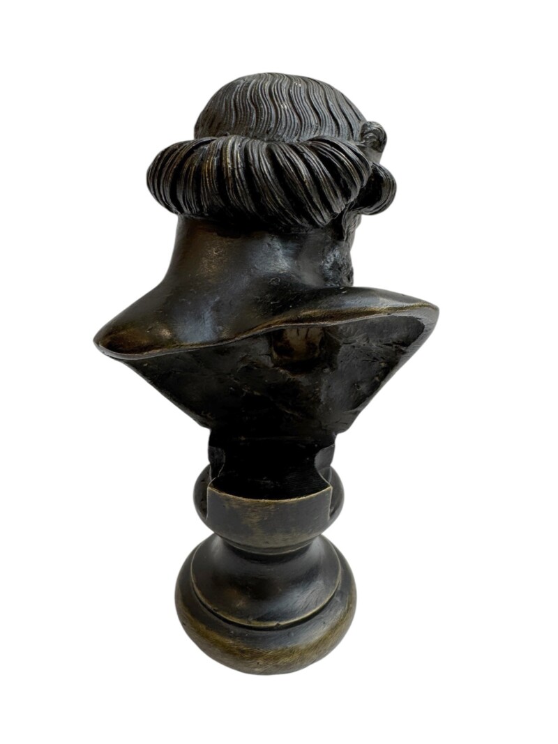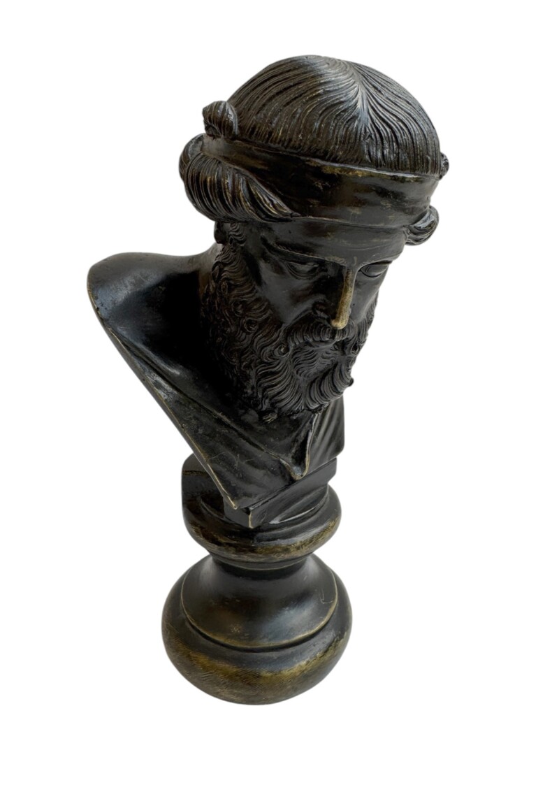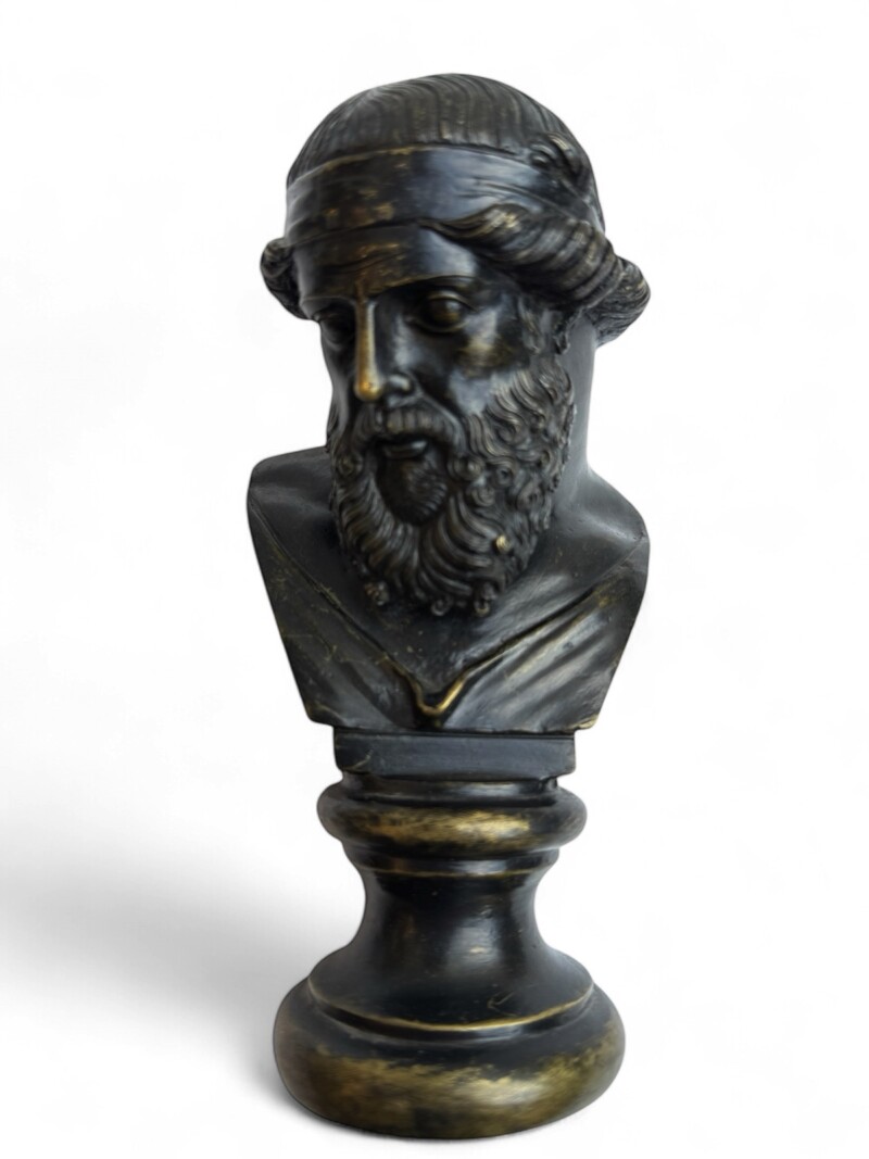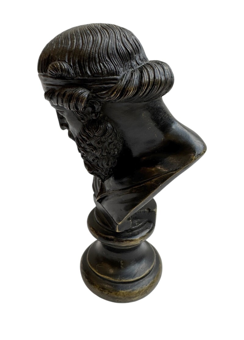 Exquisitely sculpted, reflecting the Ancient Greek ideal of beauty. Identical larger busts can be seen in the National Archaeological Museum in Naples and on the Island of Capri, Villa San Michele. The history of the original bust, dating from the mid-1st century AD and found in 1754 in the peristyle of the so-called Villa of the Papyri at Herculaneum, had long been misidentified as Plato, but was, in fact, an upper part of a herm, most likely of Dionysus, and is now preserved at the Naples Archaeological Museum.