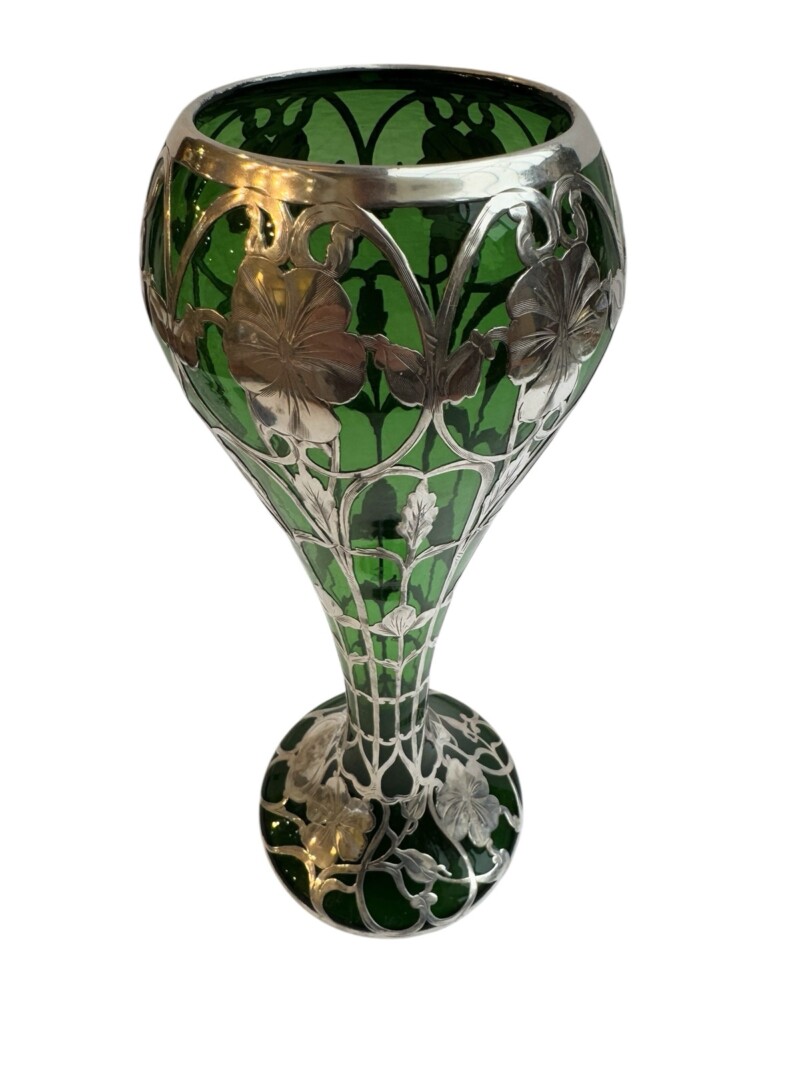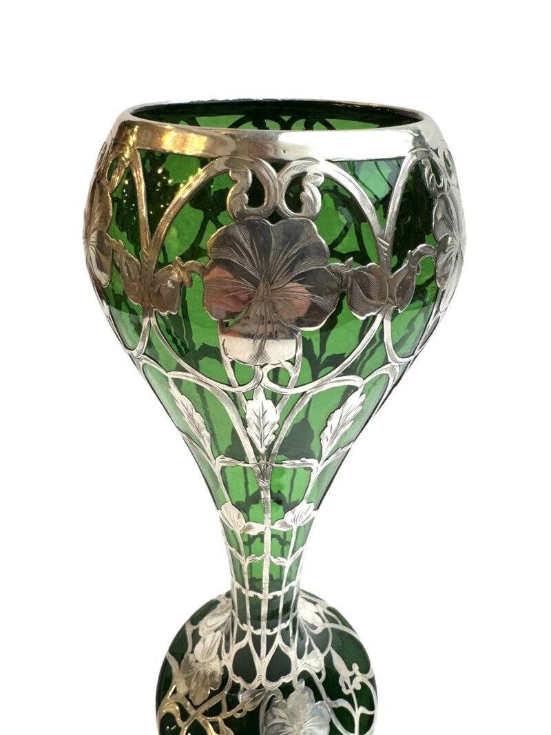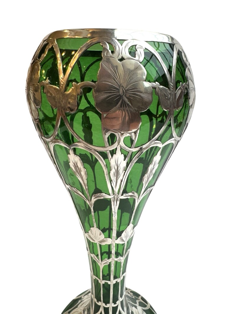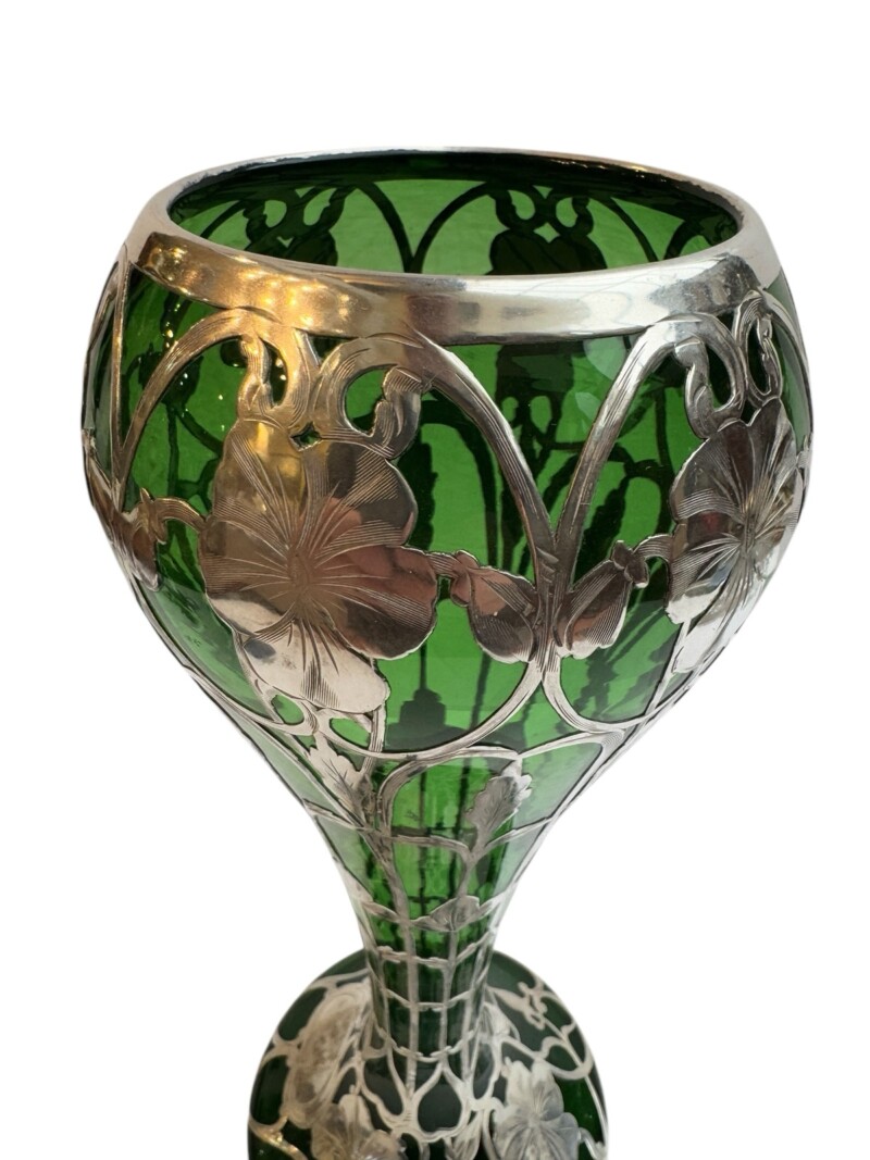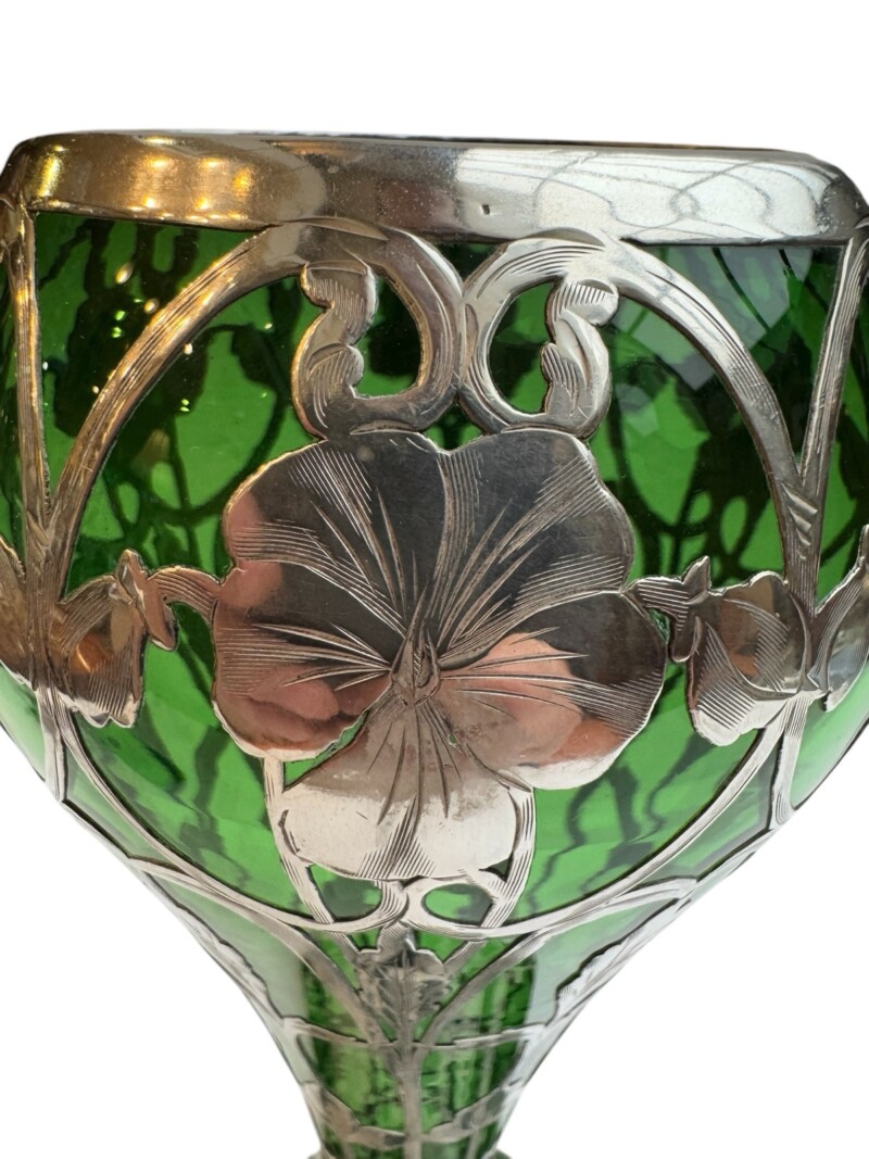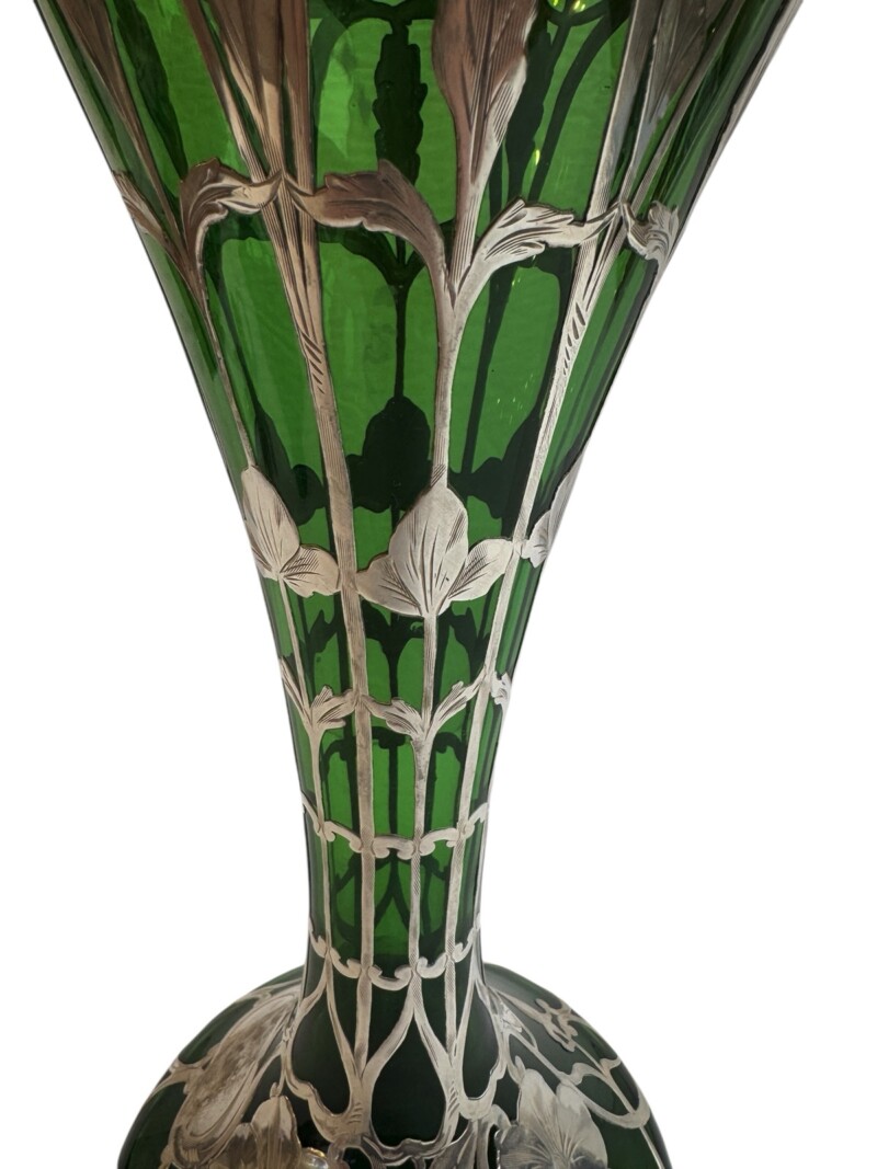 Exquisite & Large Art Nouveau Vase, Sterling Silver Overlay on Emerald Green Glass Vase by Matthews Company Circa 1910