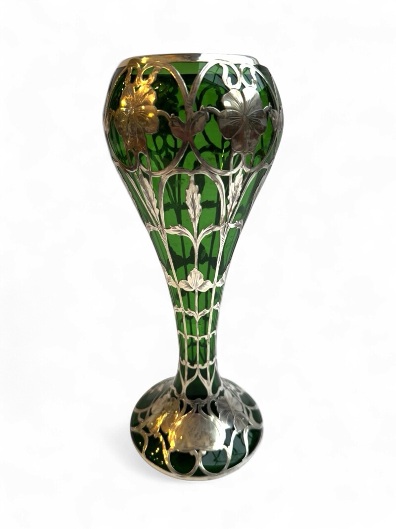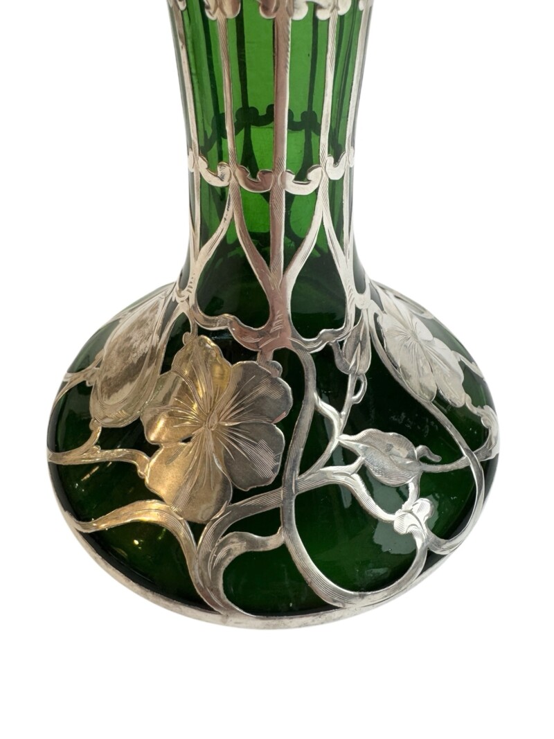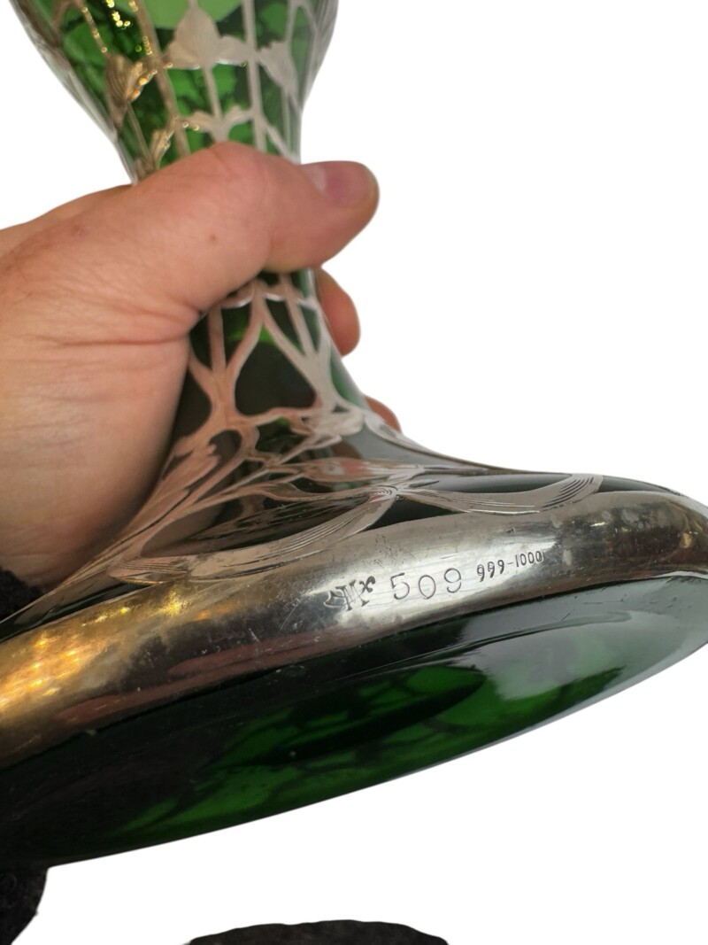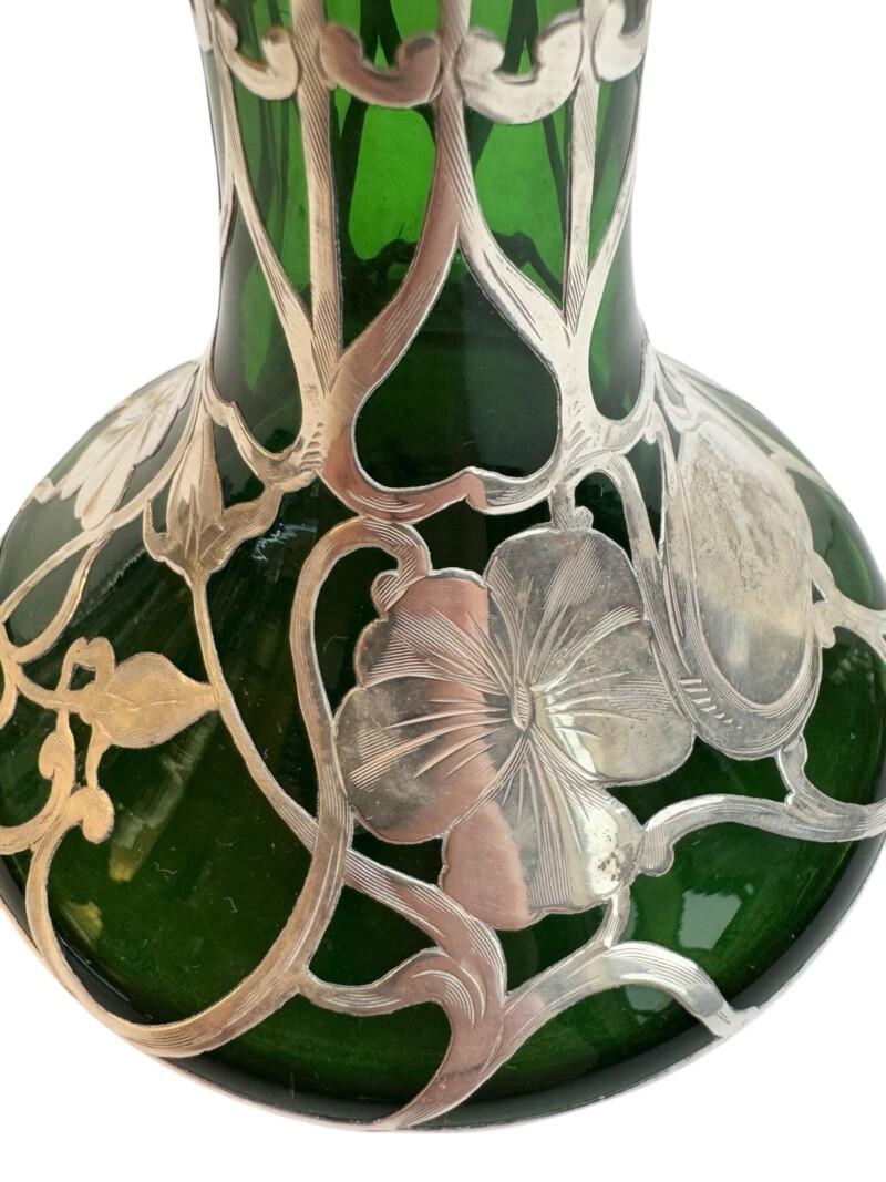 v** SOLD ARCHIVES **vFrom the American Matthews Company, a . 999 fine silver overlay, emerald green glass Art Nouveau vase from the early 1900s. Hand chased with amazing engraved details on the silver overlay of “Art Nouveau style” flowers & leaves throughout. The vase is comprised of high quality, bright, emerald green glass with generous amounts of engraved and polished, fine, sterling silver in a complete vase overlay design which encircles the lip and exterior perimeter of the entire vase in a classic, floral, theme.