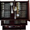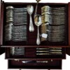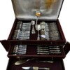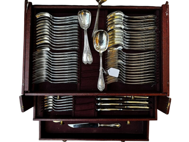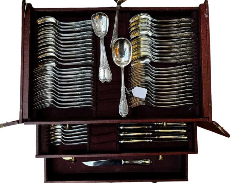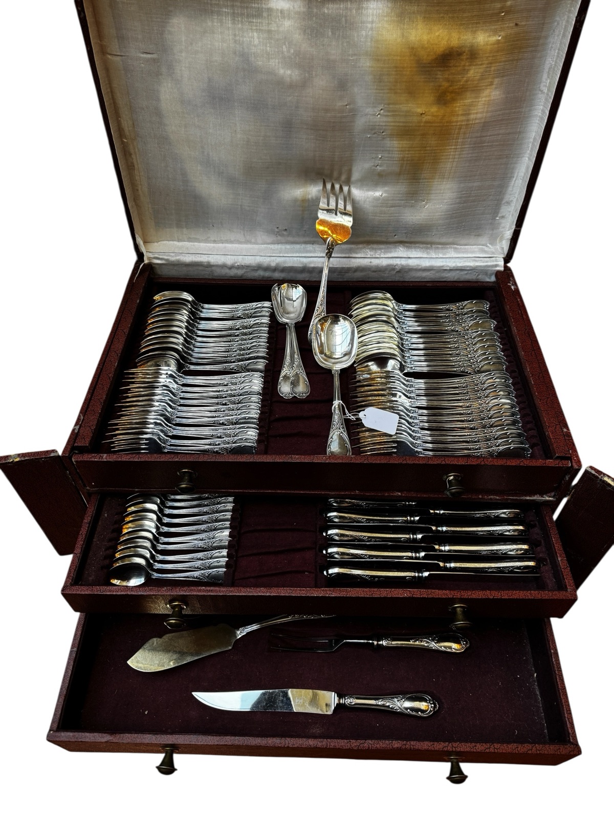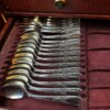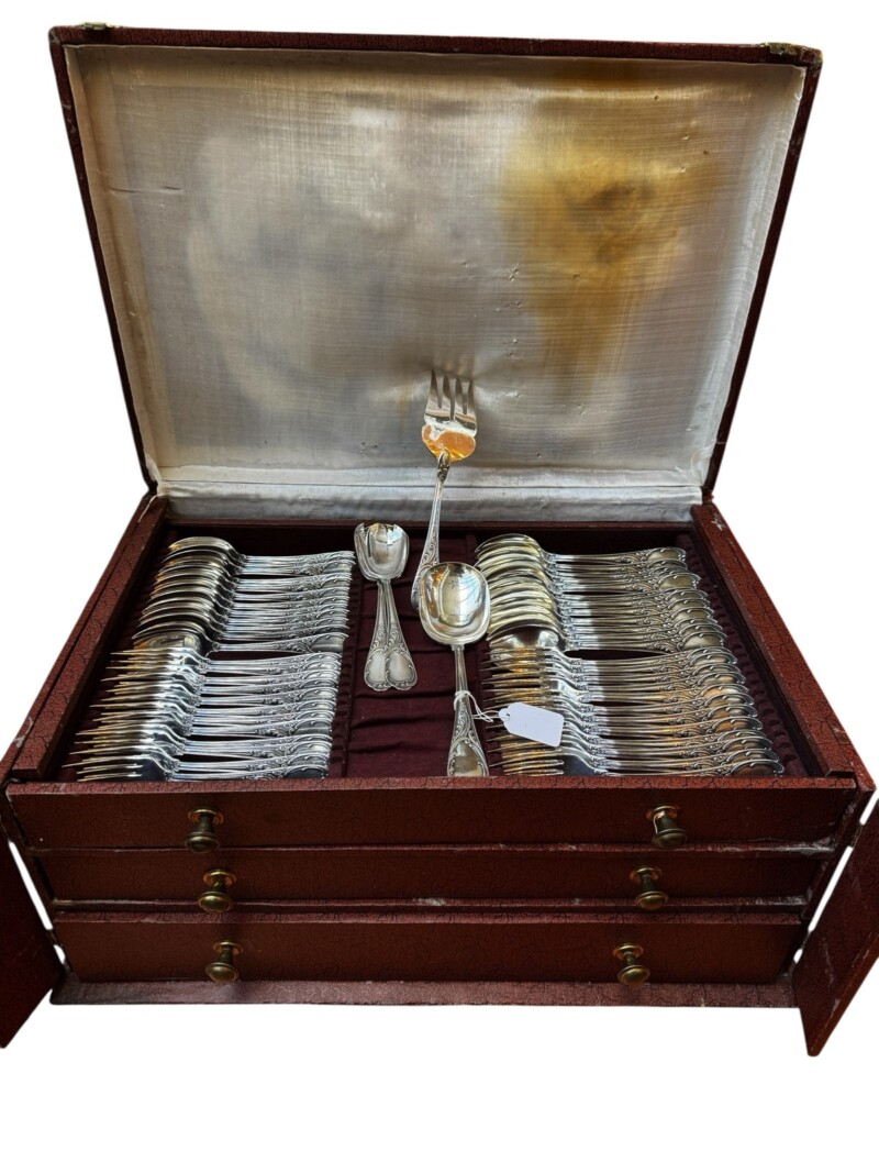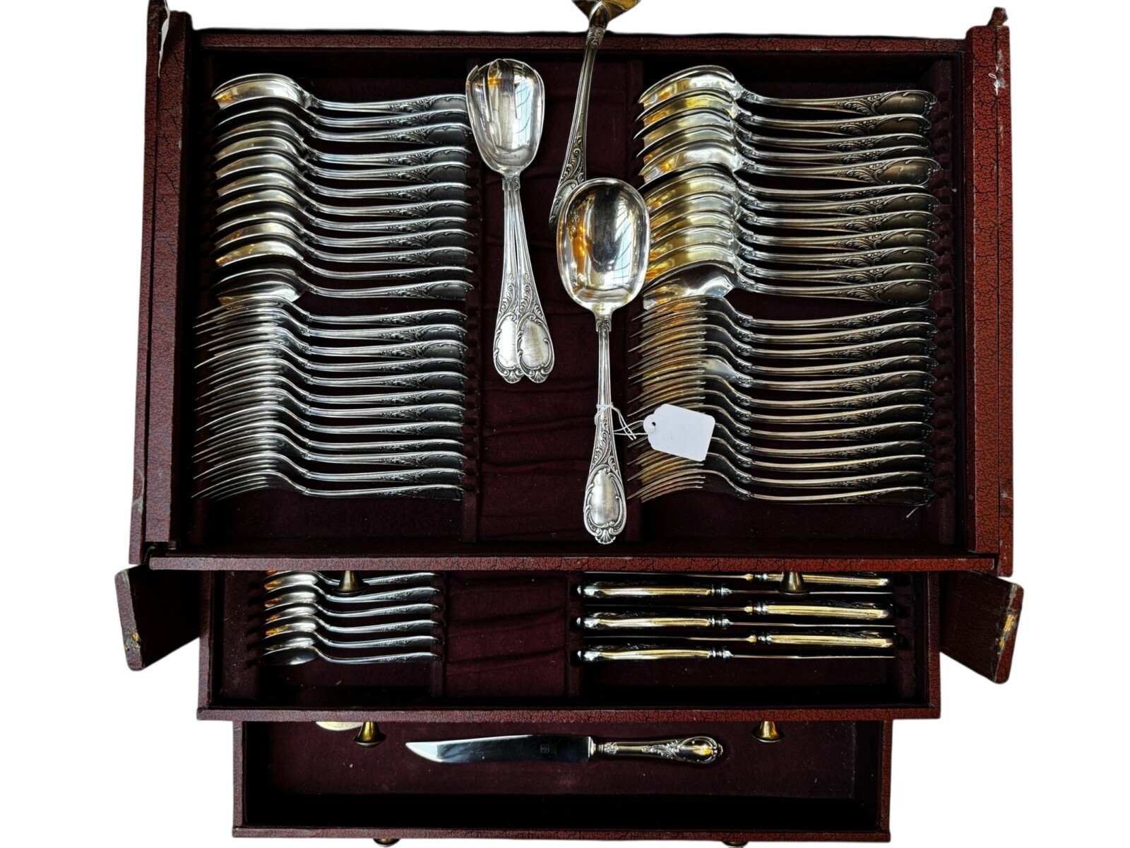 Extensive Rococo/ Louis XV Style Silver Plated Lunch & Dinner Cutlery Set, 106 Pieces for 12 Place Settings Plus 10 Serving Pieces Unengraved , Includes Large Storage Box, Alpacca Solingen Germany, Early 1900s