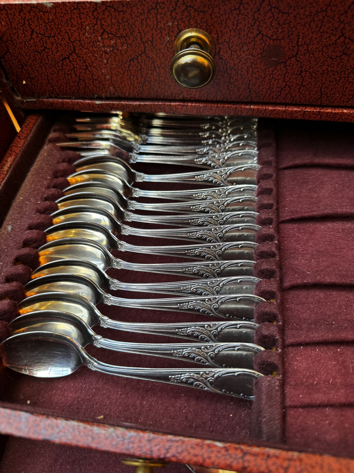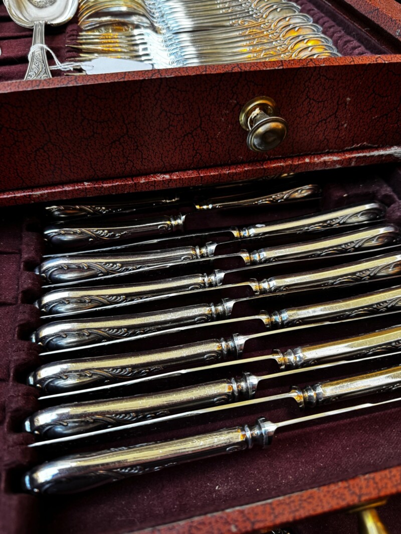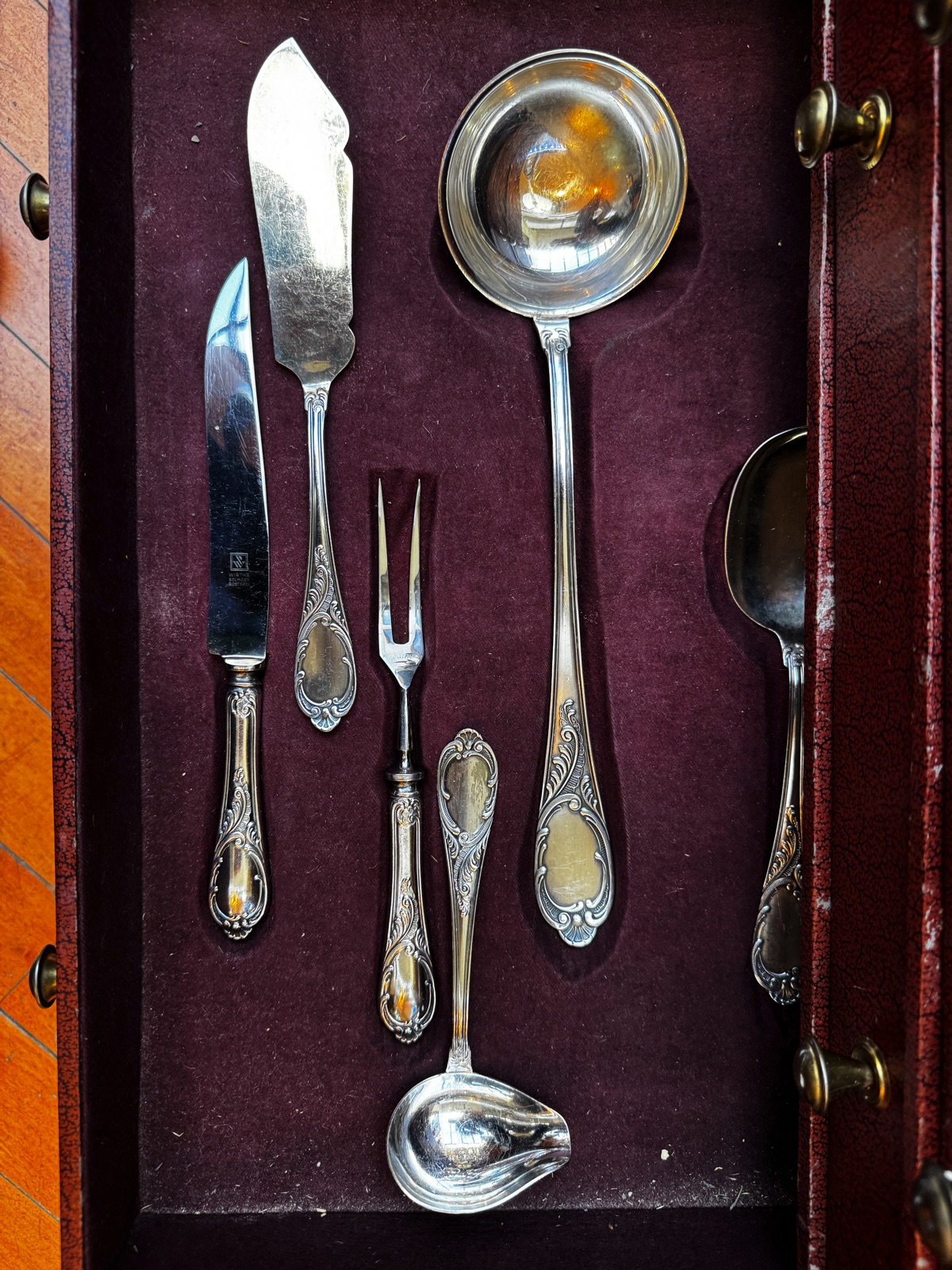 A beautiful and very extensive silver plated cutlery set in Louis XV / Rococo style. Consisting of 106 pieces, this set is suitable for lunch or dinner for 12 people and includes 10 serving pieces, richly decorated with tendrils, shells and C and S shapes typical of the style. All parts are marked with “Alpacca Solingen” on the back referring to the base metal and that it was fabricated in Solingen Germany.  A beautiful cutlery set, in excellent condition and unengraved. Includes a large leather clad box with 3 drawers and side handles. Ideal for large groups, creating a luxurious classic atmosphere, whether for lunch or dinner.
