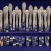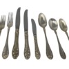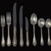 12 dinner knives 9 3/4″,12 dinner forks 7 1/2″, 12 lunch knives 7″,             12 lunch forks 7″, 12 salad/dessert forks 6 1/4″, 12 dessert spoons 7 1/4″,  12 cream soup spoons 6″, 12 teaspoons 6″, 12 five o’clock spoons 5 1/4″, 12 demitasse spoons 4″, 12 butter knives 6 1/2″, 12 fish forks 5 1/2″