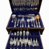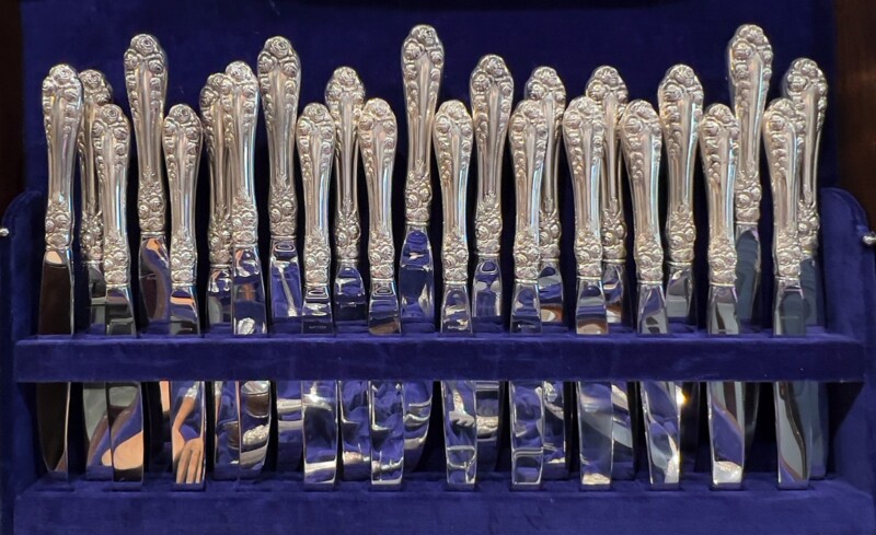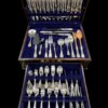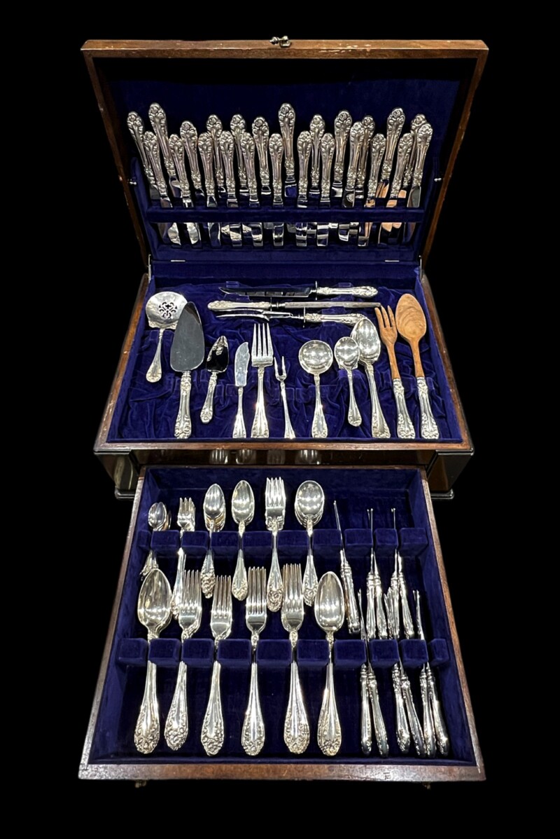 The huge original wood box, lined in royal blue velvet gives this collection a wonderful heirloom quality that reflects the enduring appeal of sterling silver and the classic design of the “Normandy Rose” pattern. Perfect for a family event or dinner party.