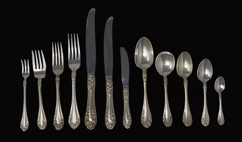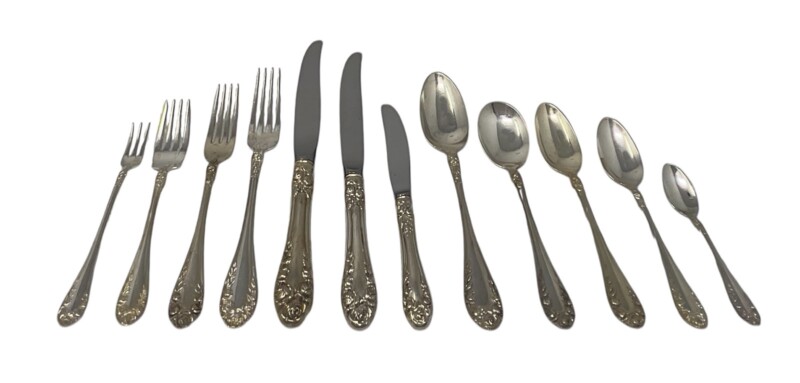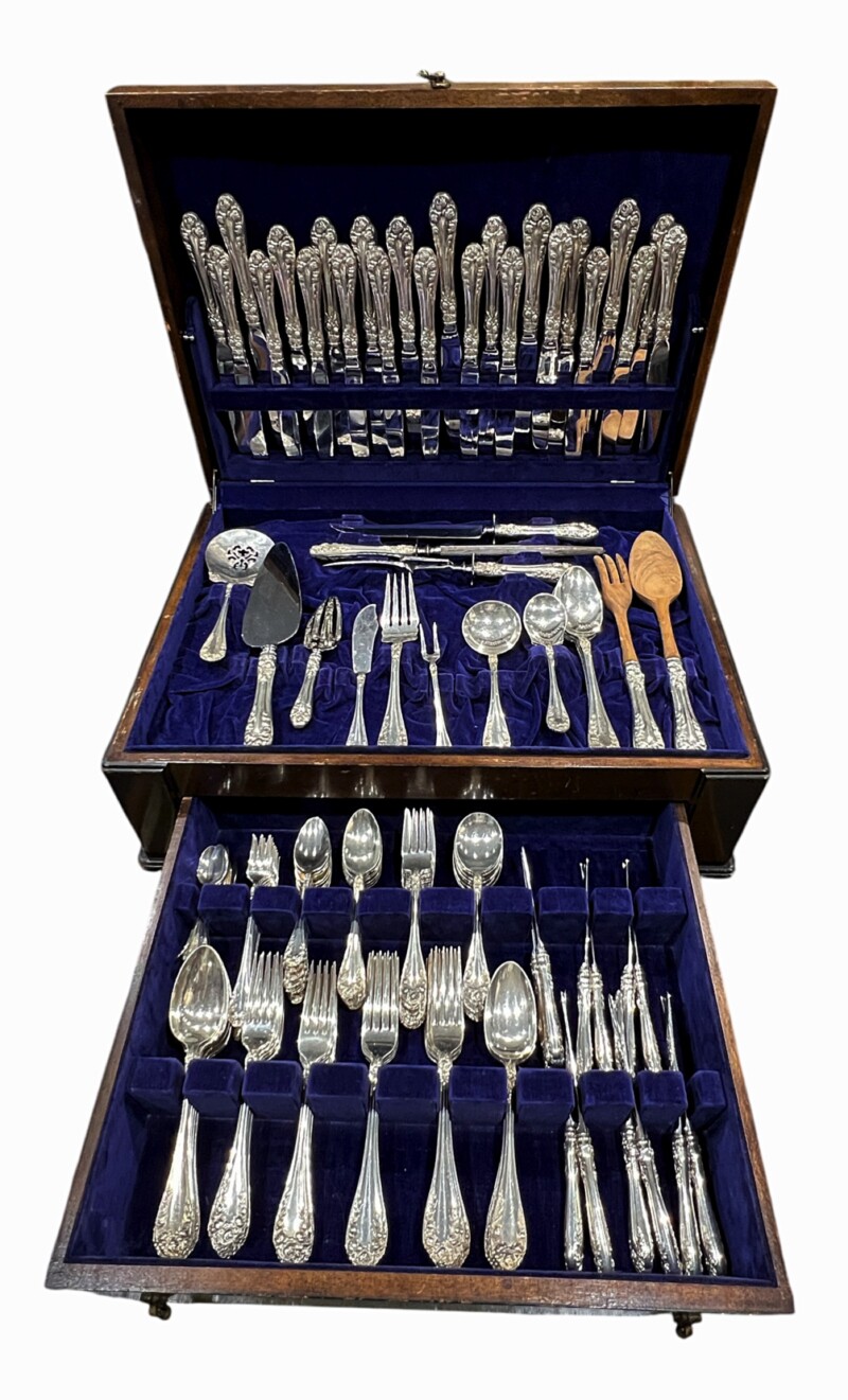 Extensive & Very Grand Canadian Sterling Silver Flatware Set by Northumbria,”Normandy Rose ” Pattern, 12 Table Settings, 12 Pieces Per Setting, Plus 17 Serving Pieces, Grand Total 161 Pieces, Circa 1950