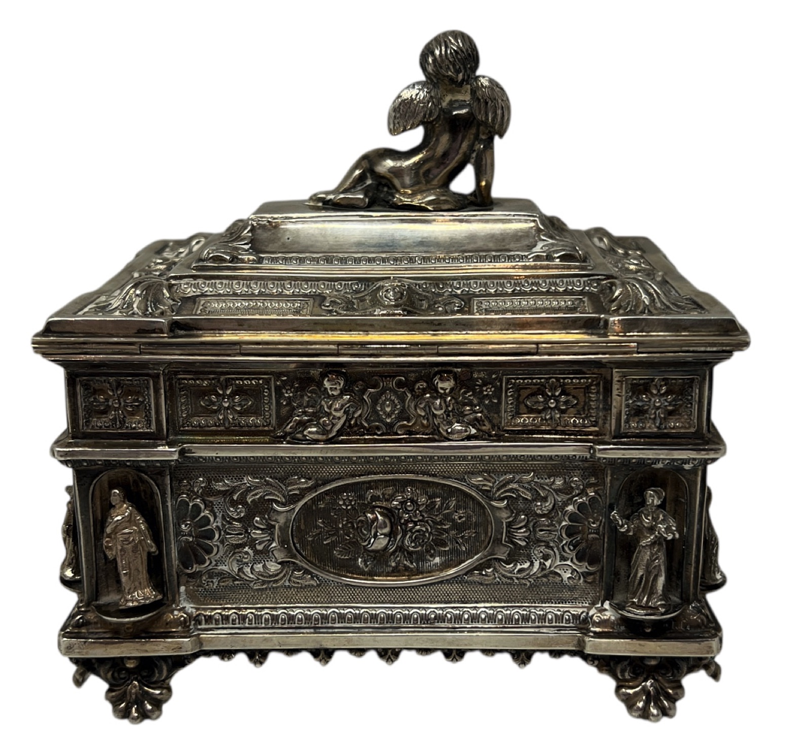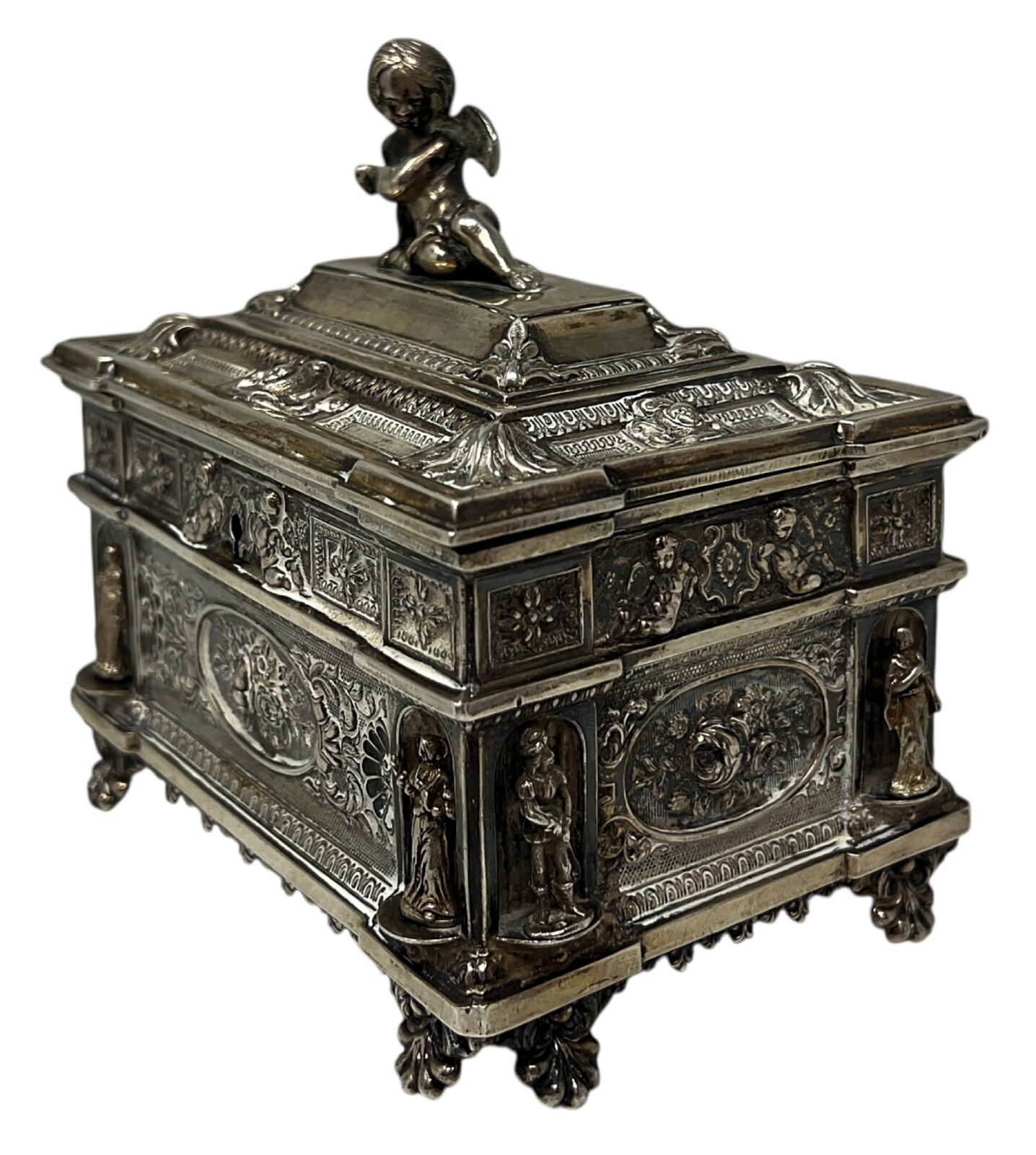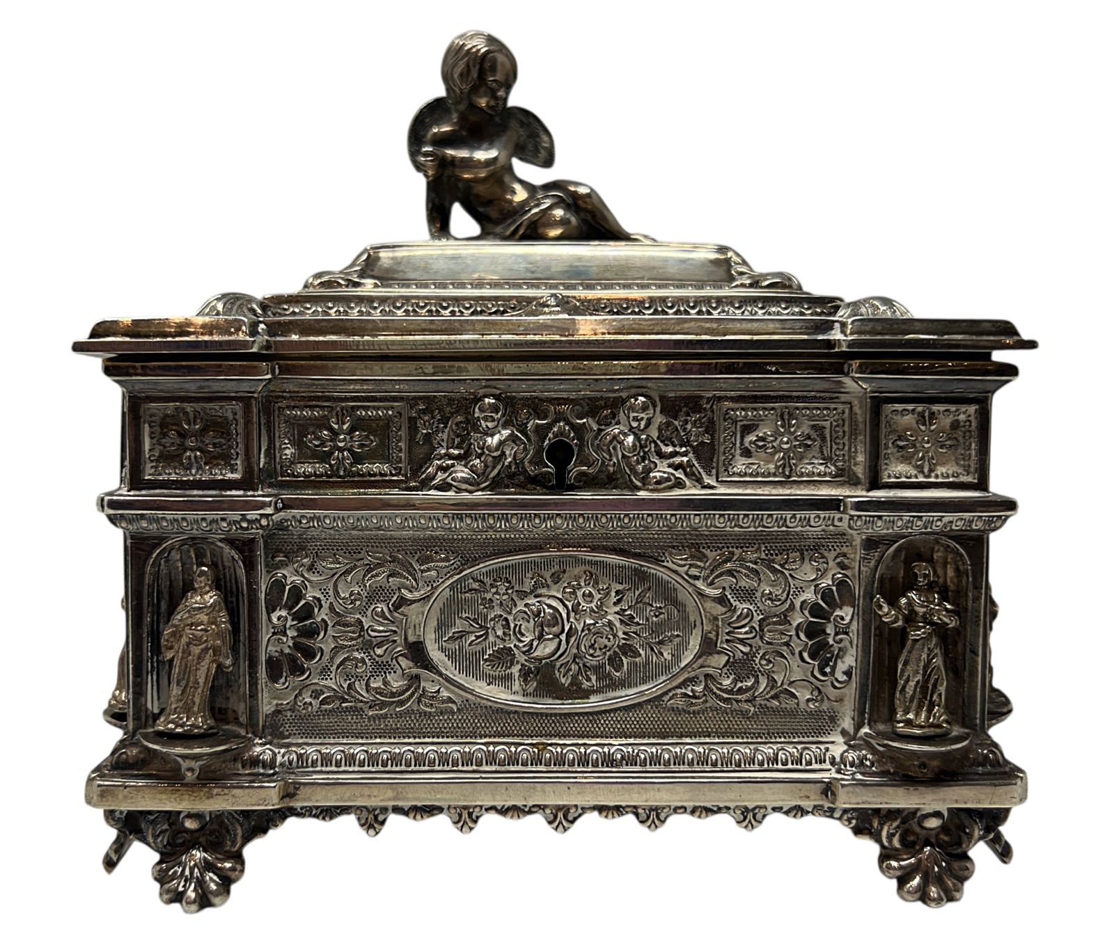Silver HollowareA extraordinary late 19th century Viennese silver sugar casket box in the “Renaissance Revival” style likely from the 1870s. Finely crafted piece with a hinged lid and an extraordinary level of textural detail with repousse and hand chased foliate motifs. The lid features a winged putti finial and the base has a Renaissance architectural-inspired design. The casket box exterior surround is richly decorated with panels of repousse roses, shells and putti. Each of the 4 corners feature a recessed grotto with miniature figural sculptures cast in the form of maidens & soldiers, raised overall upon embossed petal shaped supports. The interior has an original gold wash.