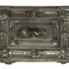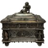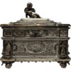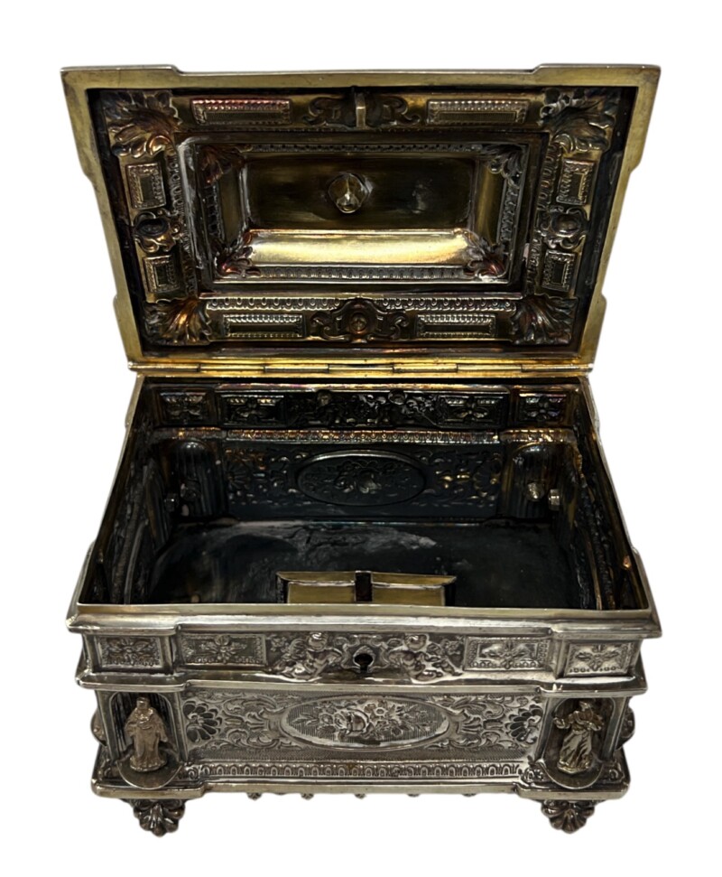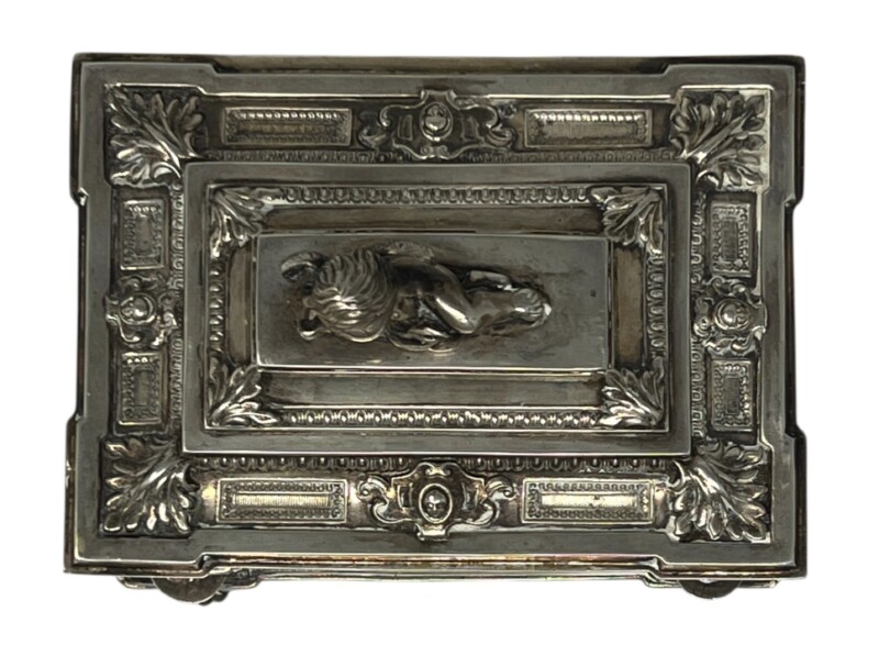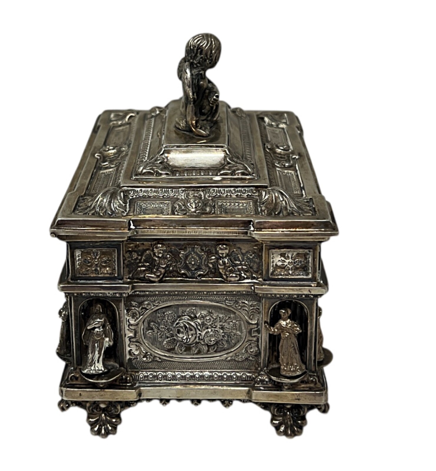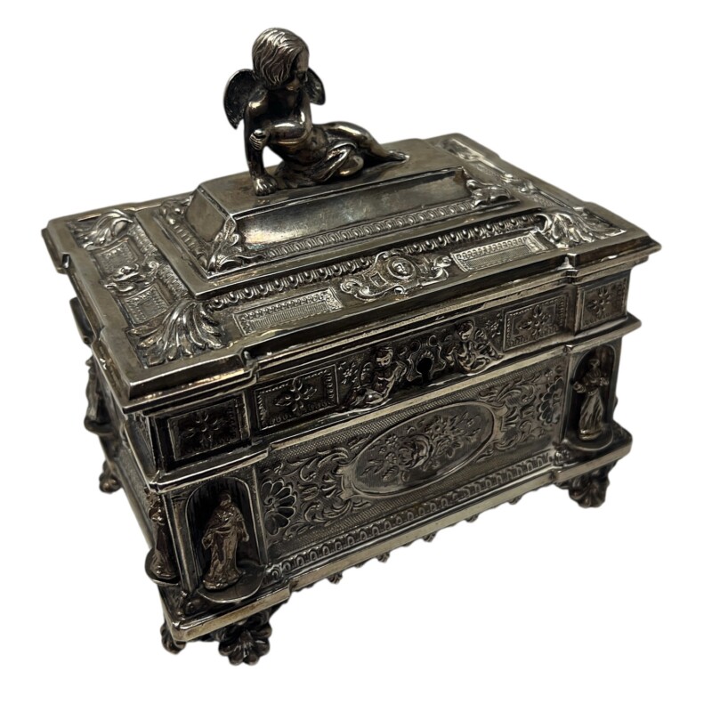 Silver HollowareA extraordinary late 19th century Viennese silver sugar casket box in the “Renaissance Revival” style likely from the 1870s. Finely crafted piece with a hinged lid and an extraordinary level of textural detail with repousse and hand chased foliate motifs. The lid features a winged putti finial and the base has a Renaissance architectural-inspired design. The casket box exterior surround is richly decorated with panels of repousse roses, shells and putti. Each of the 4 corners feature a recessed grotto with miniature figural sculptures cast in the form of maidens & soldiers, raised overall upon embossed petal shaped supports. The interior has an original gold wash.