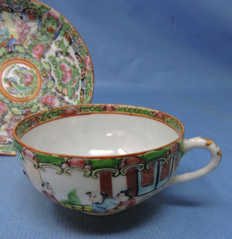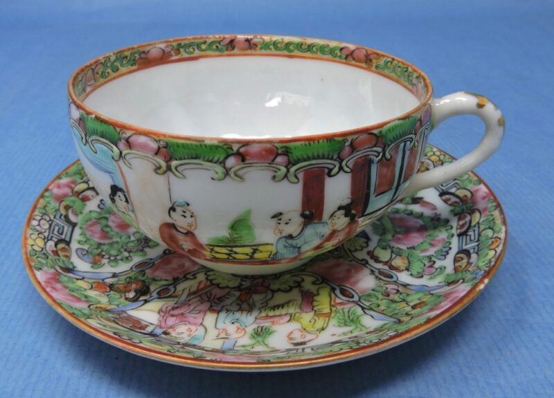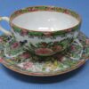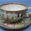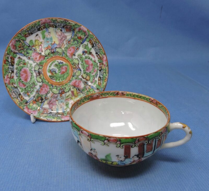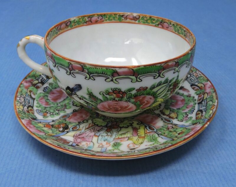 Oriental / AsianA gorgeous Chinese painted porcelain wide mouth cup and saucer in the “Famille Rose” pattern. Both pieces have a white background and are decorated with colourful figures, fruit, birds, flowers and leaves. The handle of the cup and the rims of both the cup and saucer are trimmed in gold.