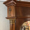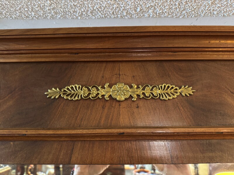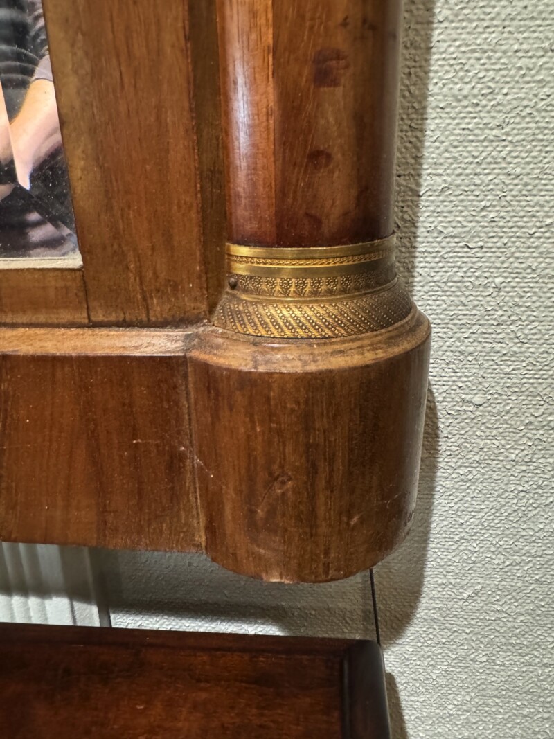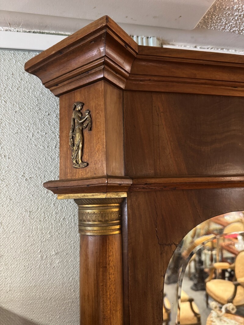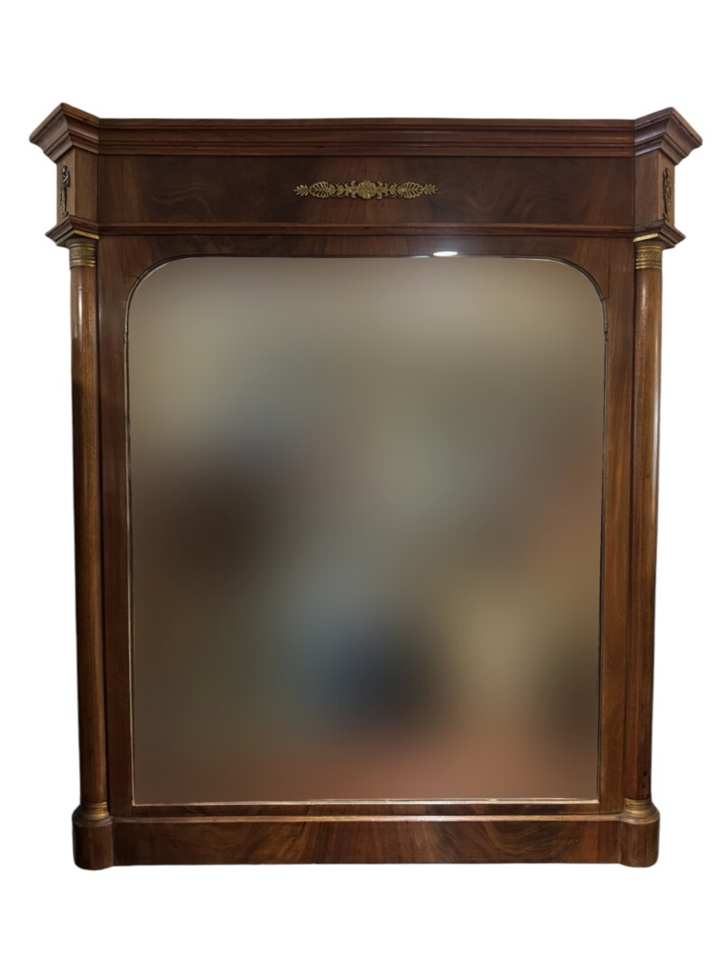 Fantastic and large French Empire ( circa 1880) mahogany wall mirror with Neoclassical design elements. The mirror’s bevelled edge adds to its elegance along with the bronze mounts on the generous “architectural” design of the mahogany surround and columns. Adds that extra “grandeur” to any room.