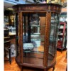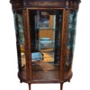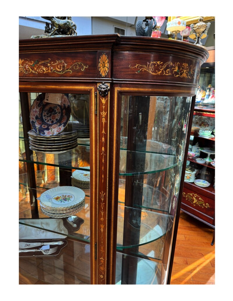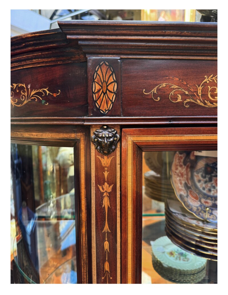Original beautiful tall Edwardian display cabinet in mahogany with detailed satinwood inlay patterns, curved glass side panels and tapered legs. A large single glazed centre door with 2 gilt lion heads that reveal 4 generous shelves. Fine quality workmanship throughout.