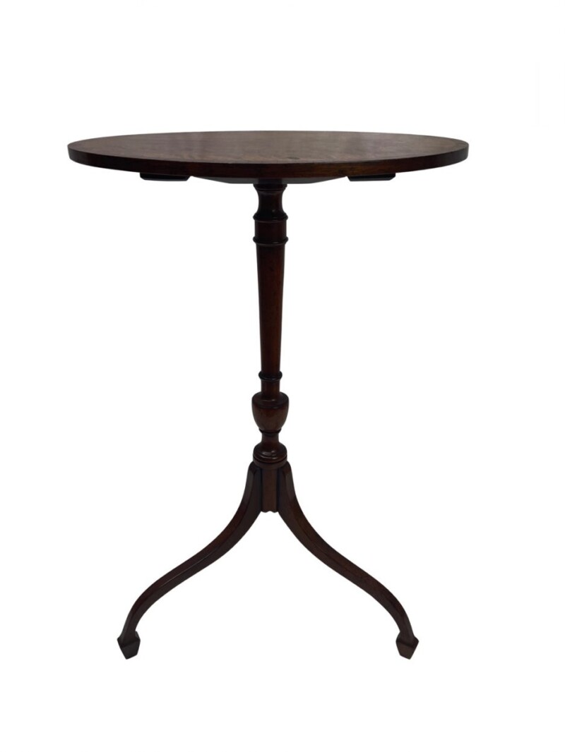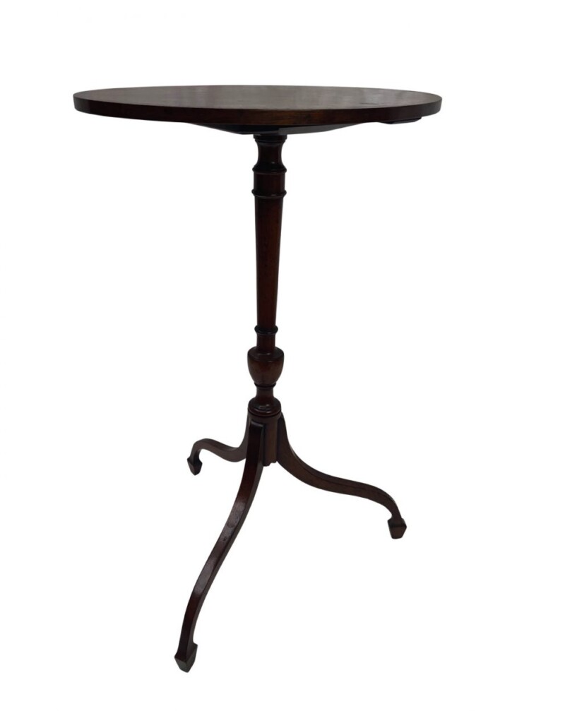 A lovely little Georgian style oval side table on a tri-footed spider base.    Very nice delicate pedestal and beautiful mahogany grain patina.   Originally purchased at in the Fine Art & Antiques department at Ogalvy’s in Montreal and has an original label.  Dates mid 20th century.