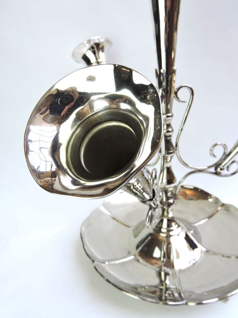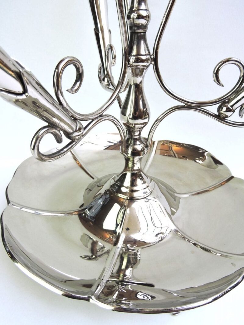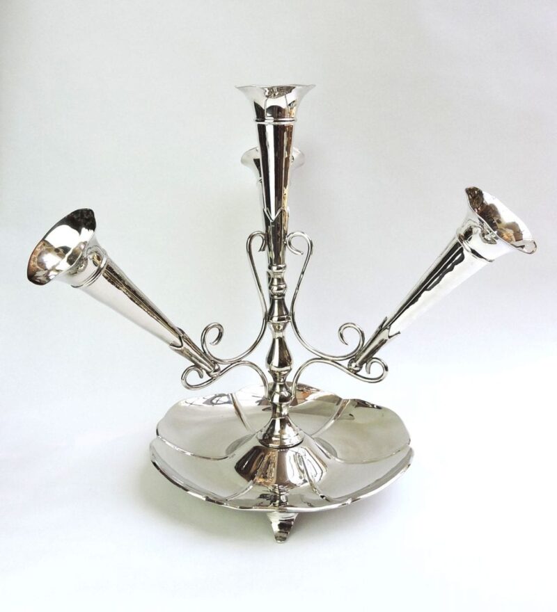 A lovely 4 trumpet silver plated epergne for flowers or just on its own. The epergne has a wide 6 ribbed base with scalloped rim and has 3 feet to add style.  Holding the detachable trumpets are sections with swirls – a very attractive looking piece.