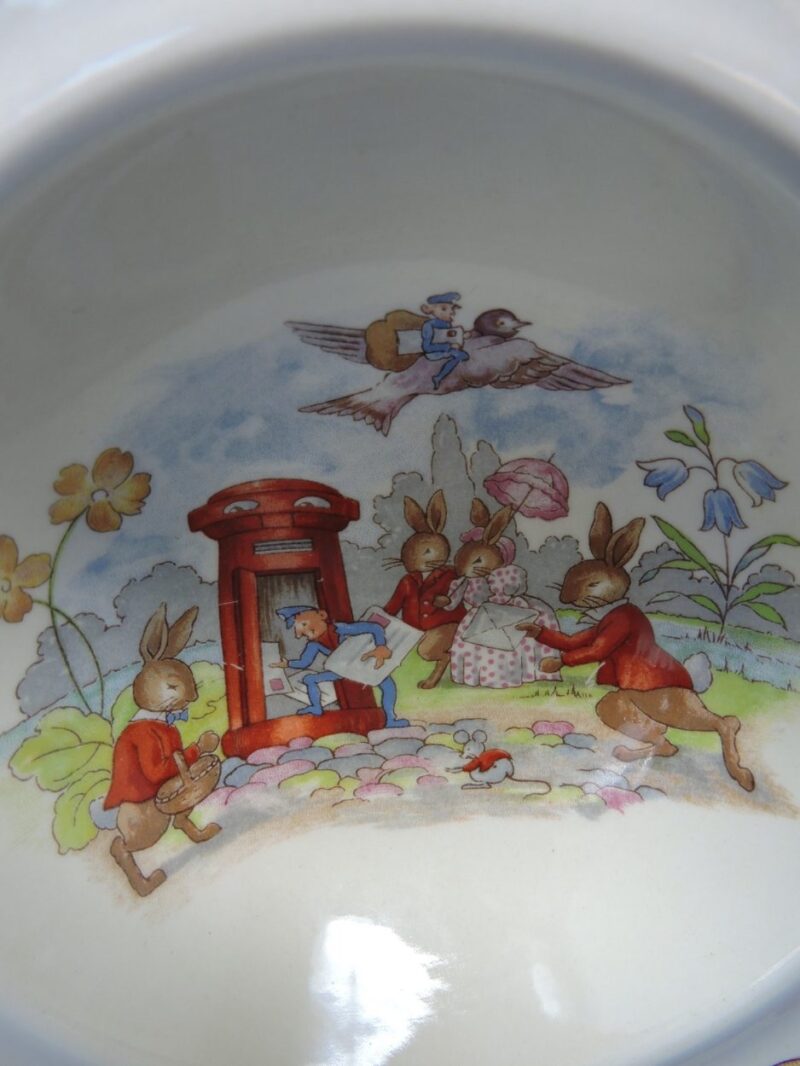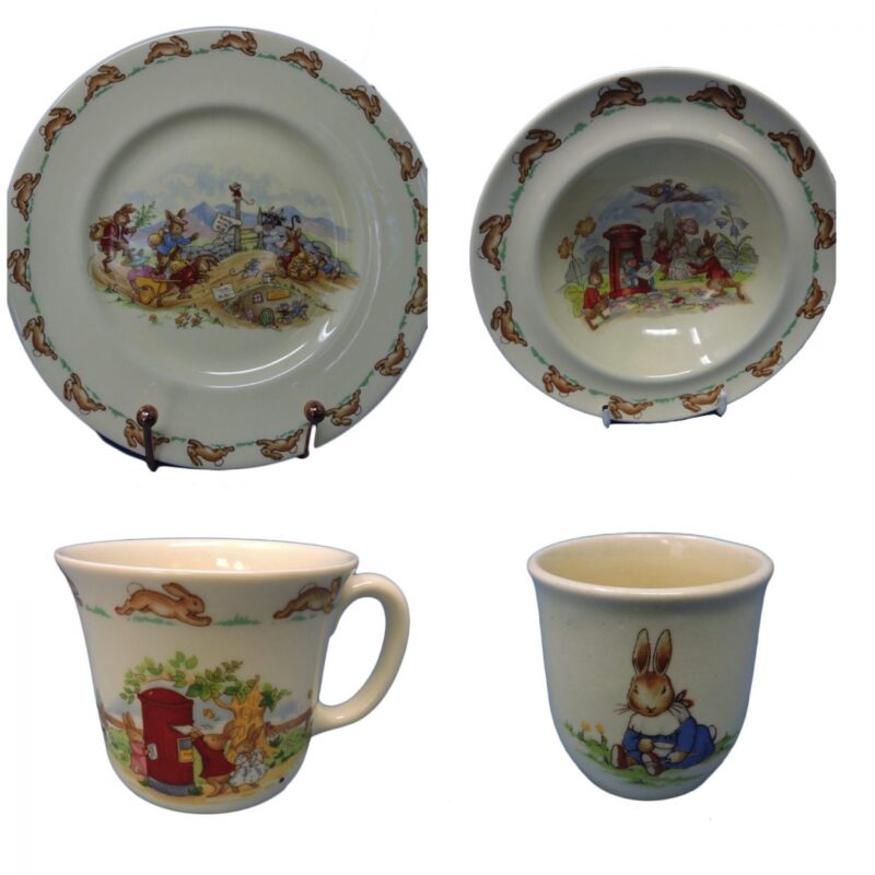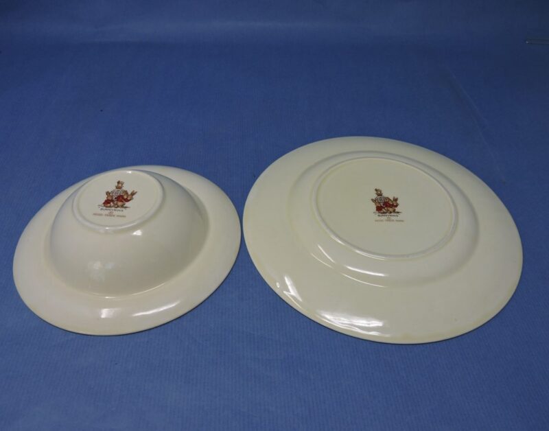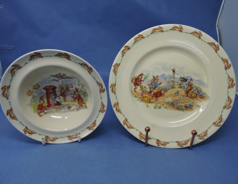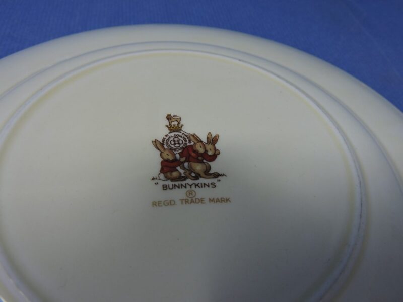 On the underside of the bowl and plate is the Royal Doulton maker’s mark and it reads “Bunnykins. Reg’d Trade Mark”.